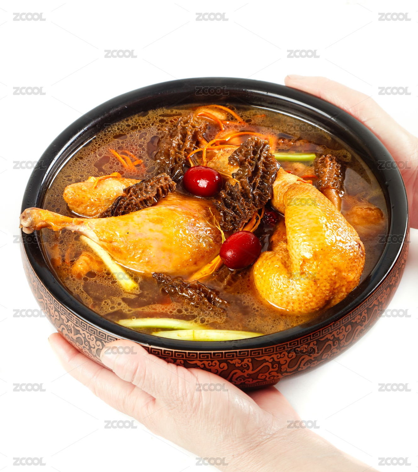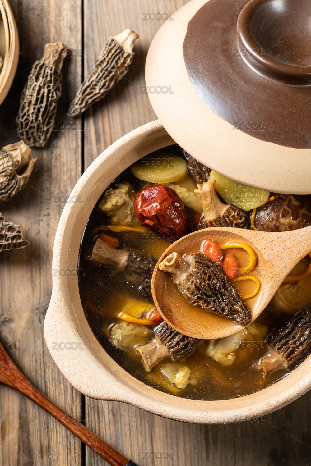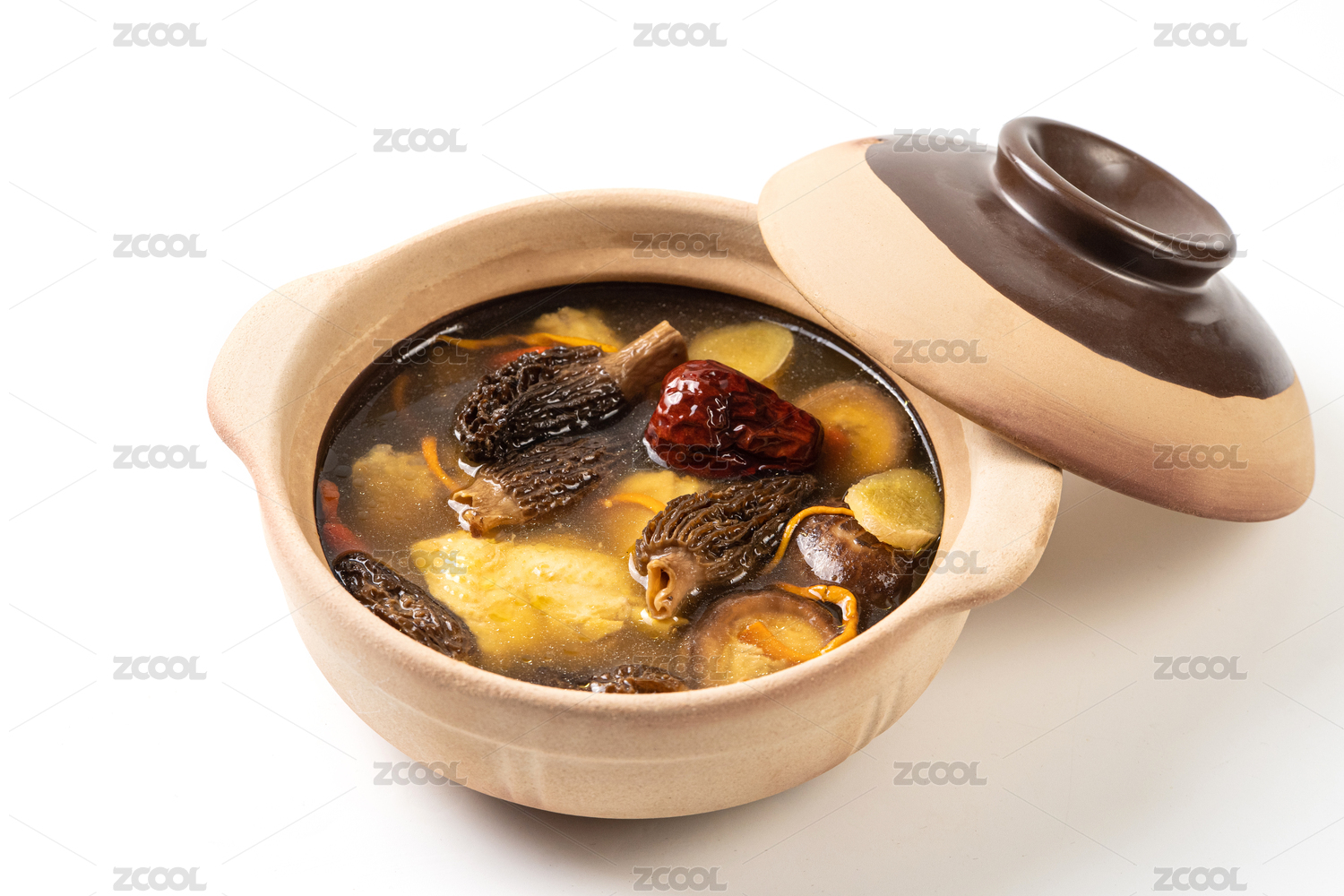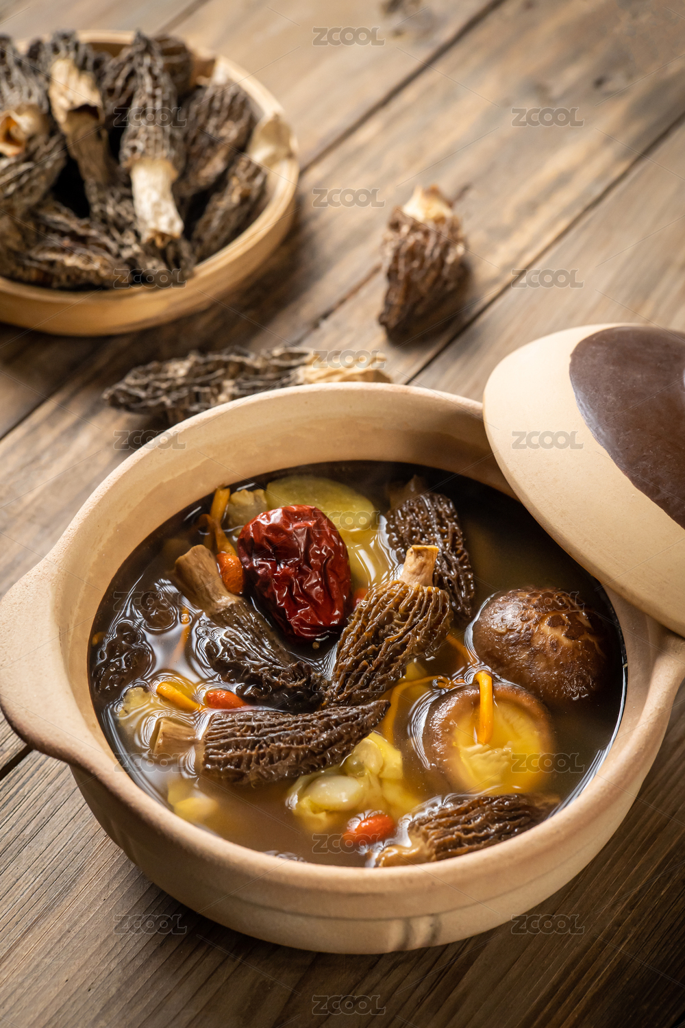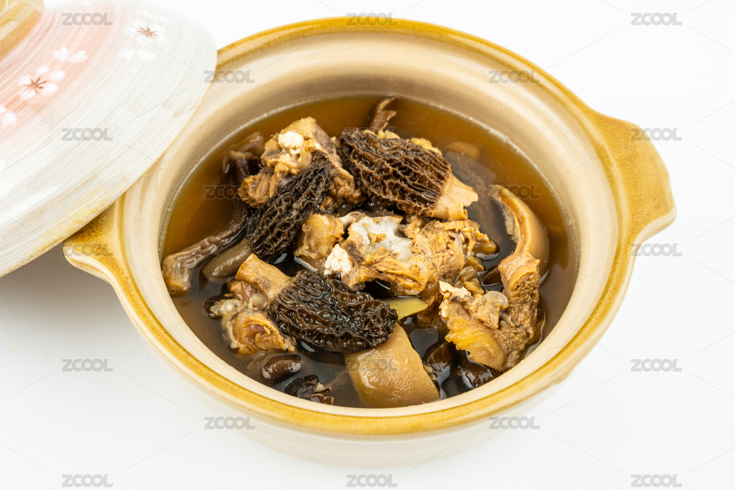 一碗羊肚菌燉湯和筷子上夾著羊肚菌