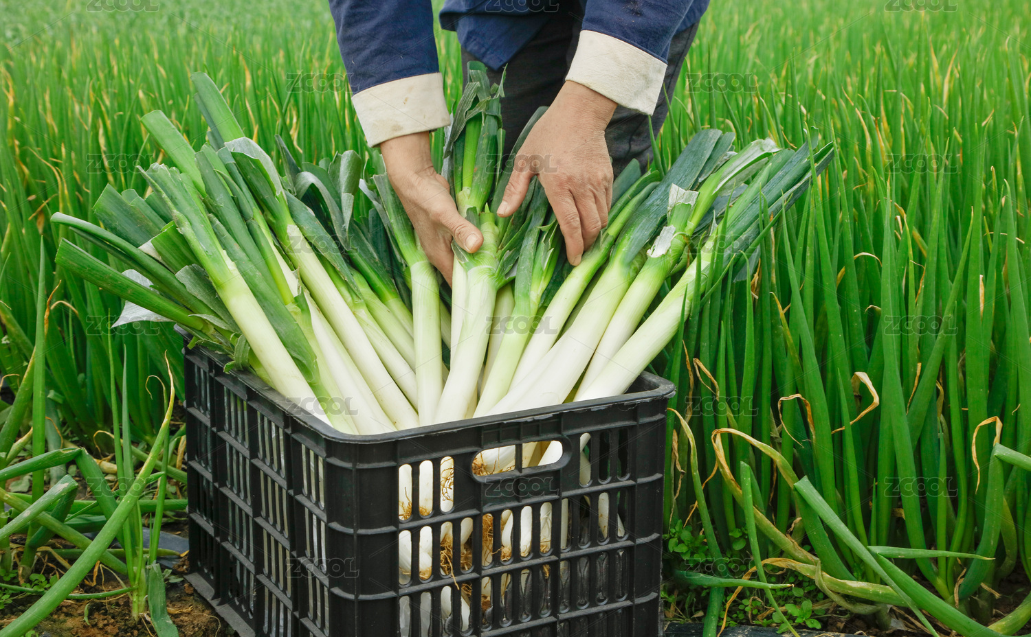田地上筐子里放著大蔥和手上拿著鐵桿大蔥