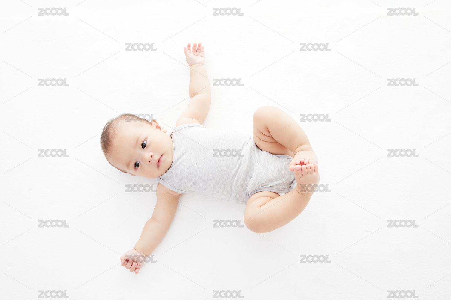 嬰兒寶寶穿著爬行服躺在白色背景上