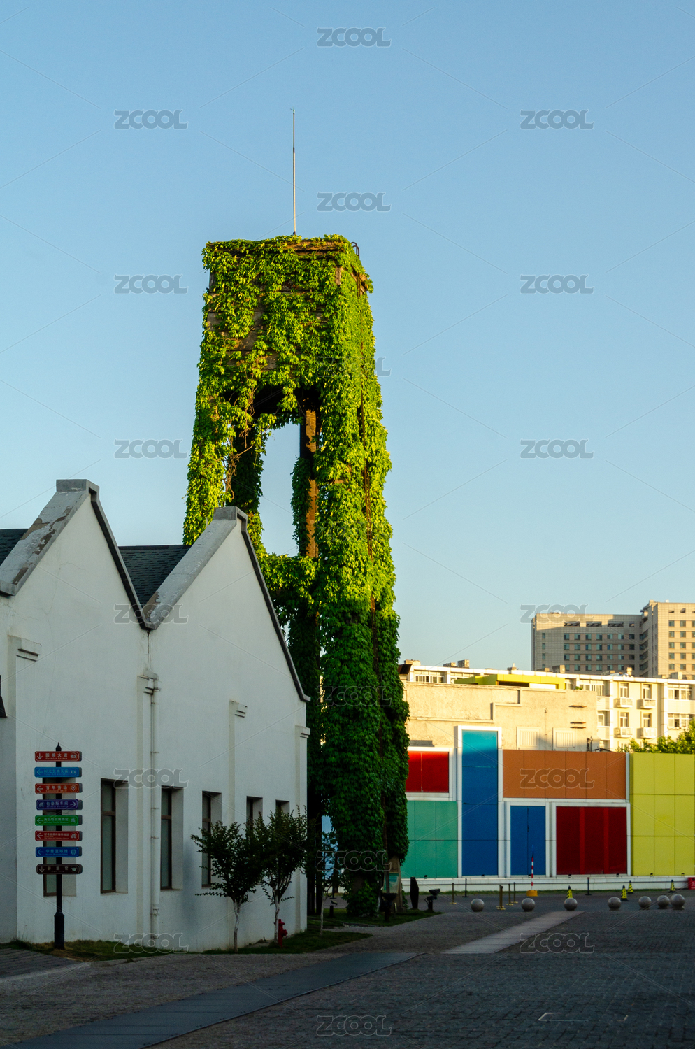 青島紡織谷爬滿綠植的塔樓與周邊建筑