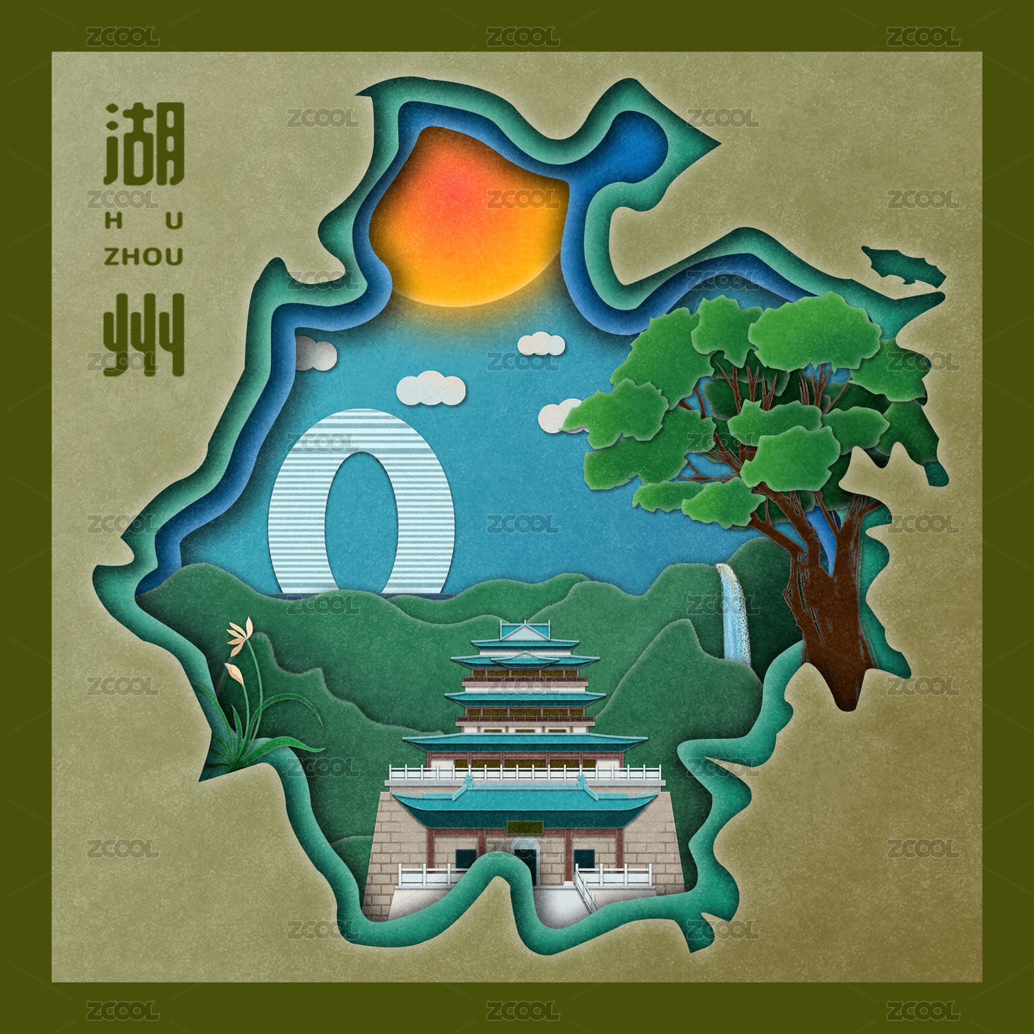 浙江湖州城市古今建筑剪紙風(fēng)插畫
