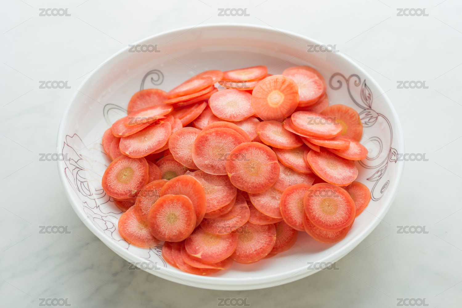 白瓷盤盛放的新鮮水果胡蘿卜圓形切片