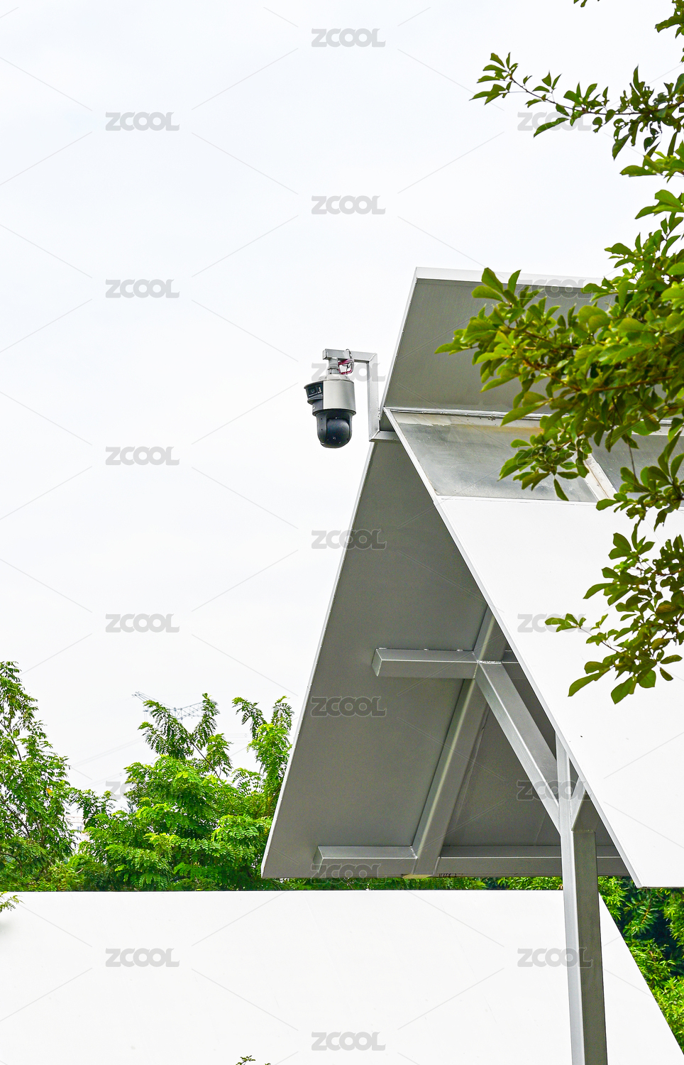 綠葉環(huán)繞的戶外建筑上安防監(jiān)控設(shè)備