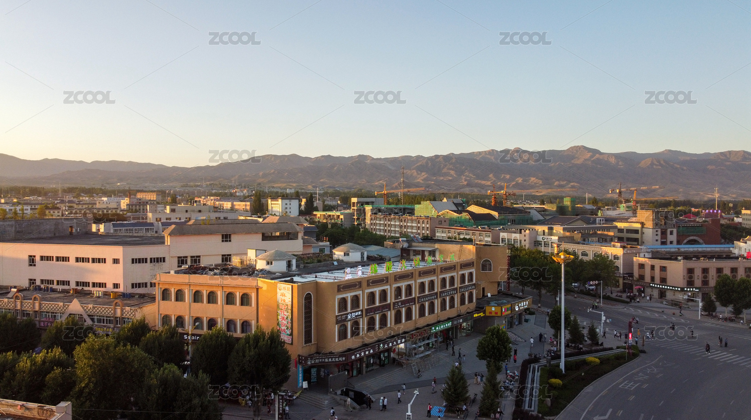 航拍黃昏時分的中國新疆伊犁特克斯縣八卦城
