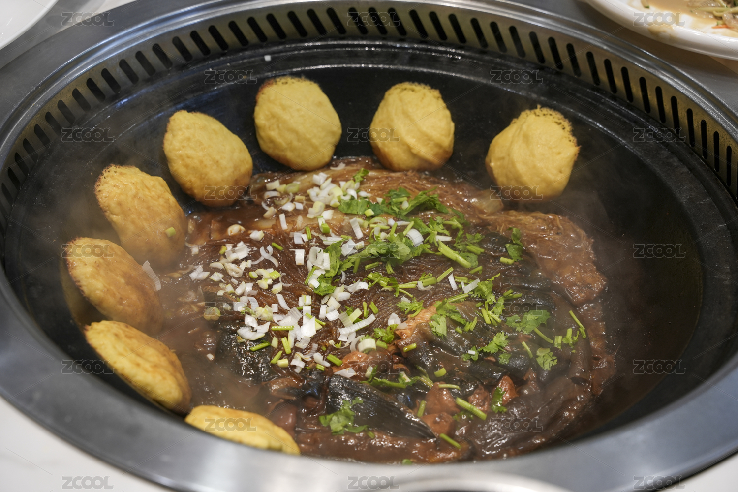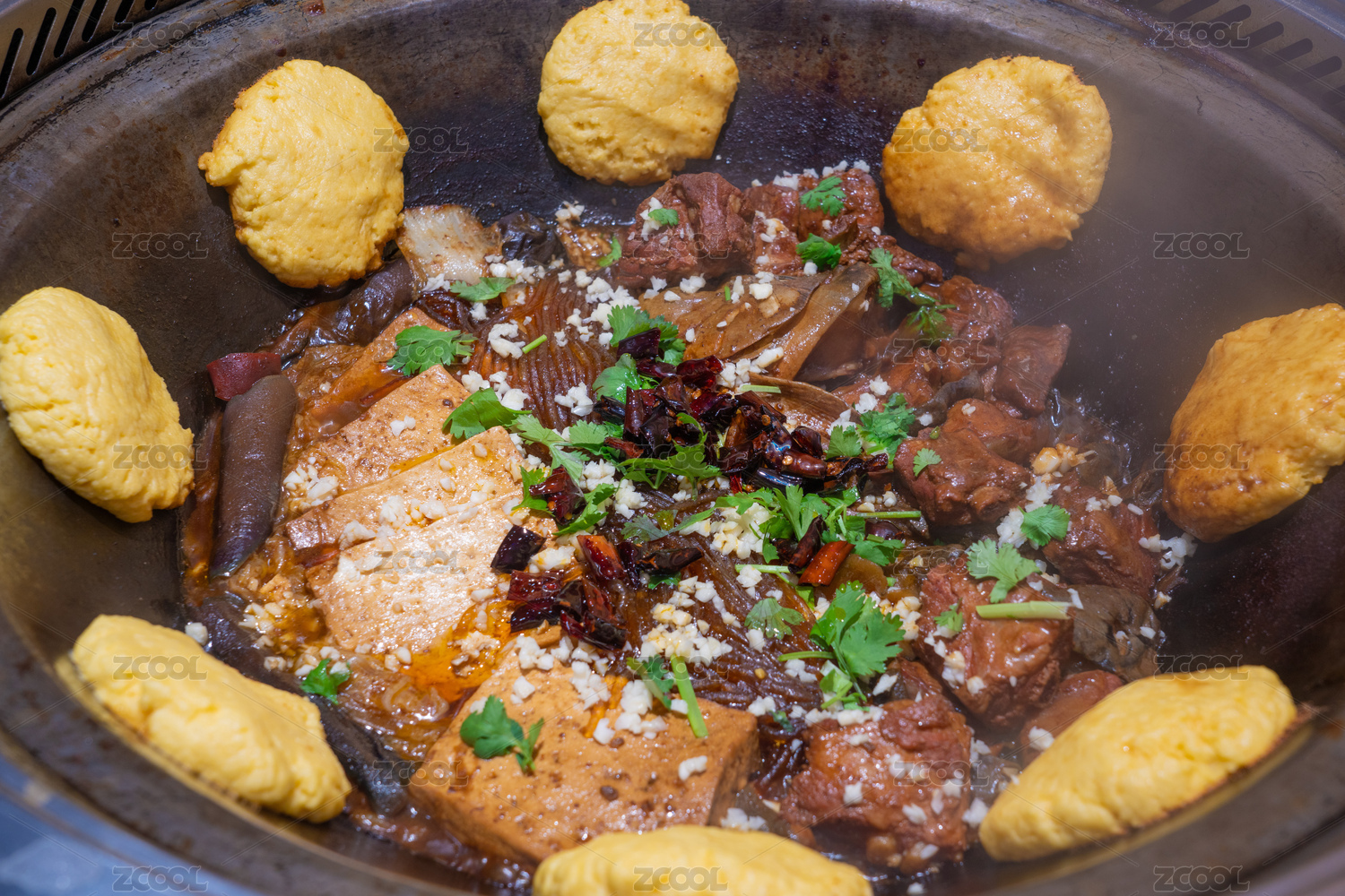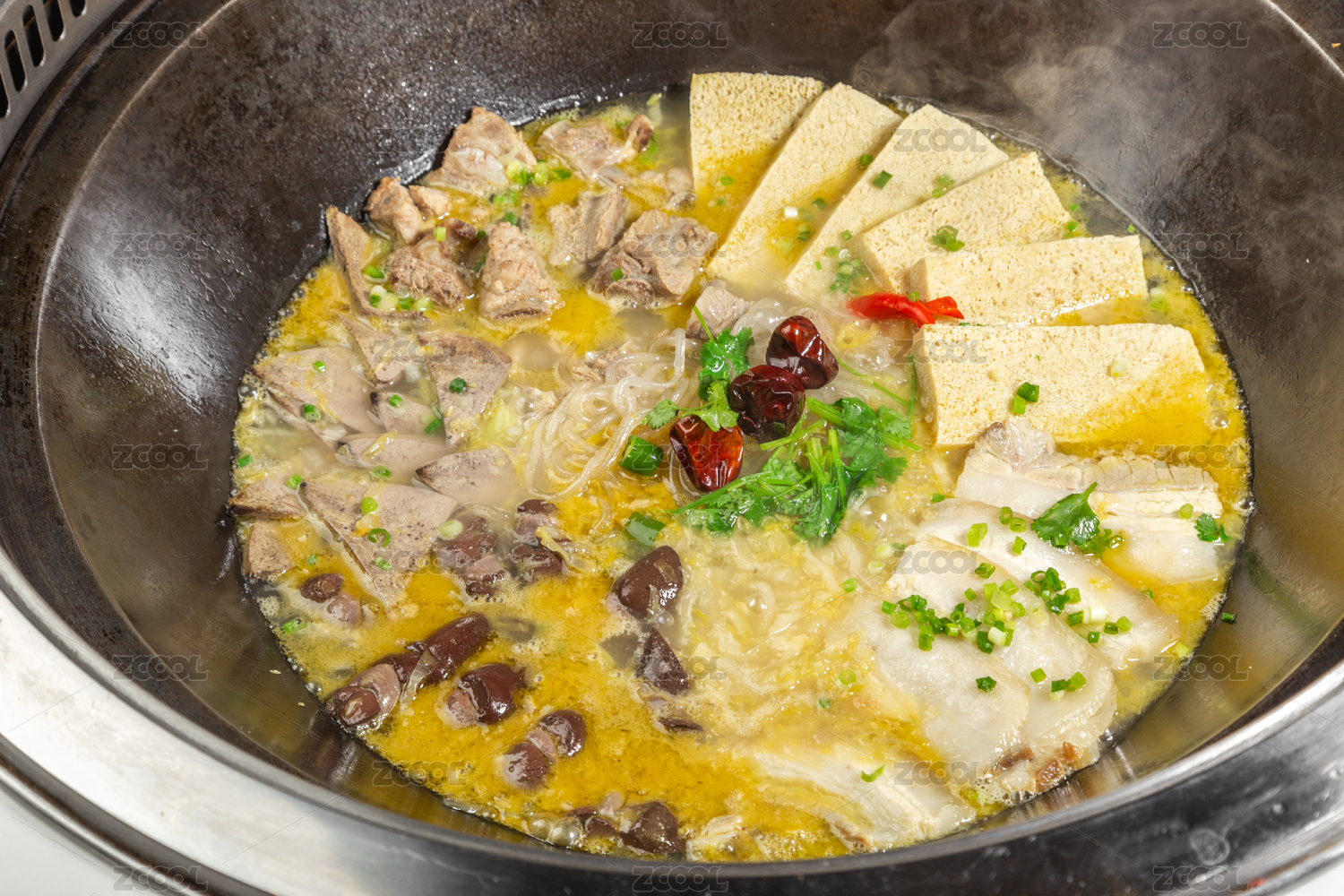 一鍋冒熱氣的四喜大豐收鐵鍋燉