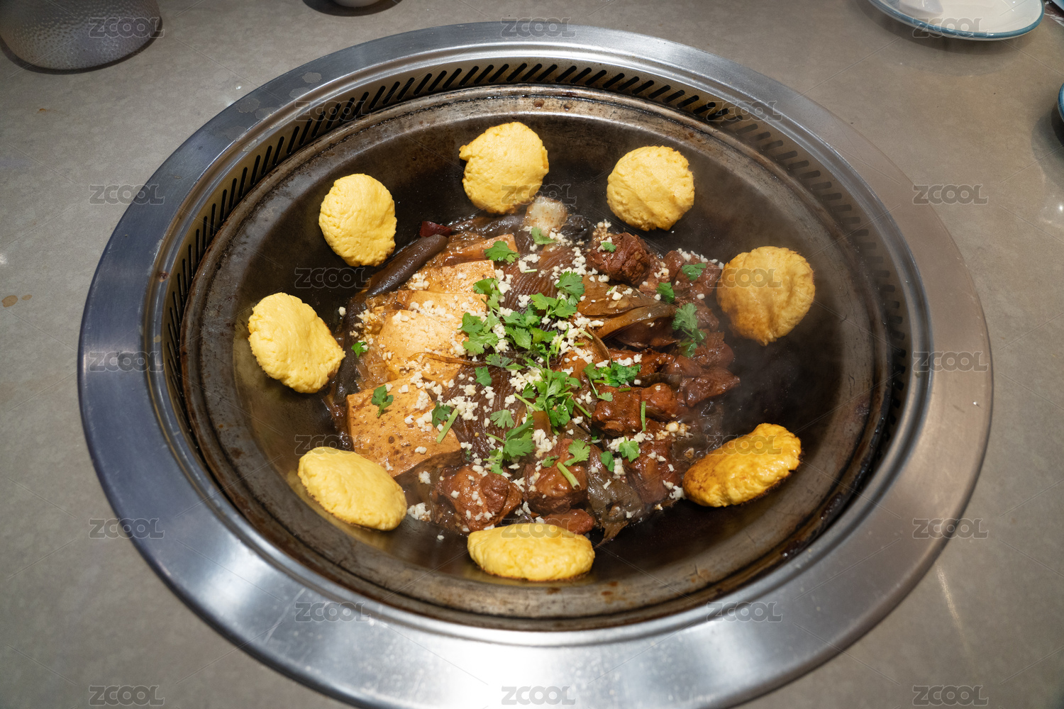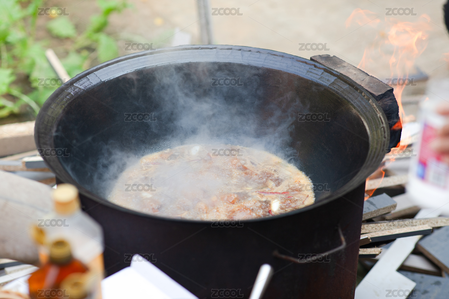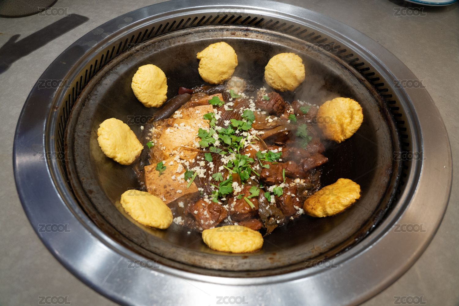 一鍋冒熱氣的四喜大豐收鐵鍋燉