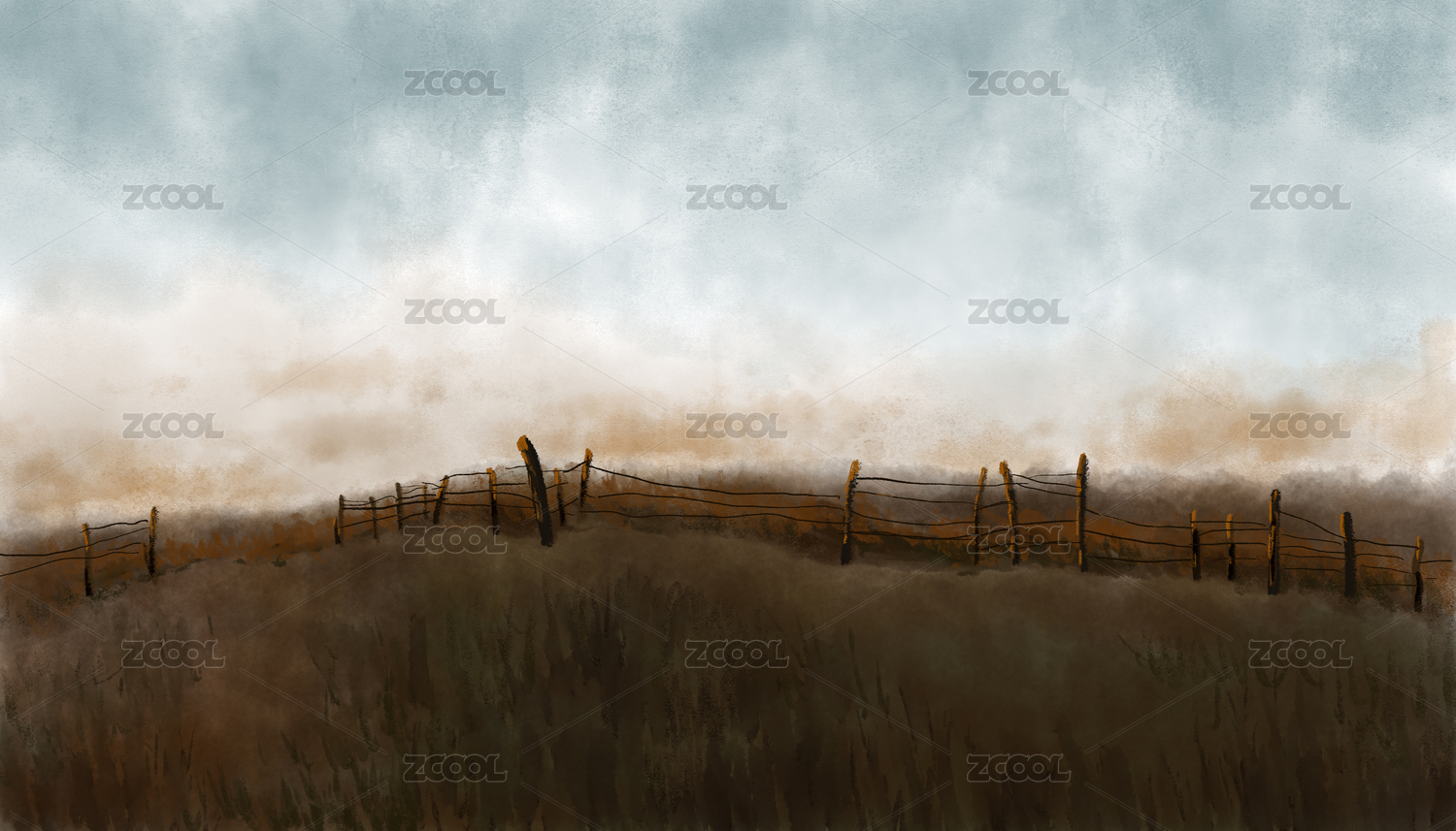 手繪插畫傍晚草地綠地木欄