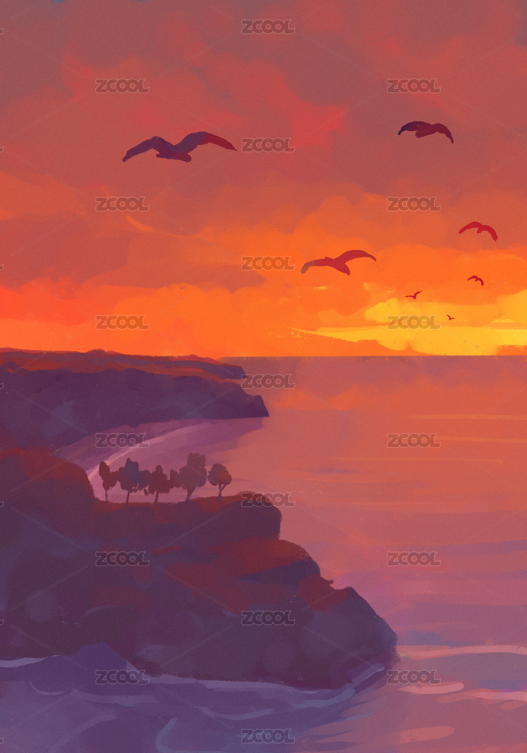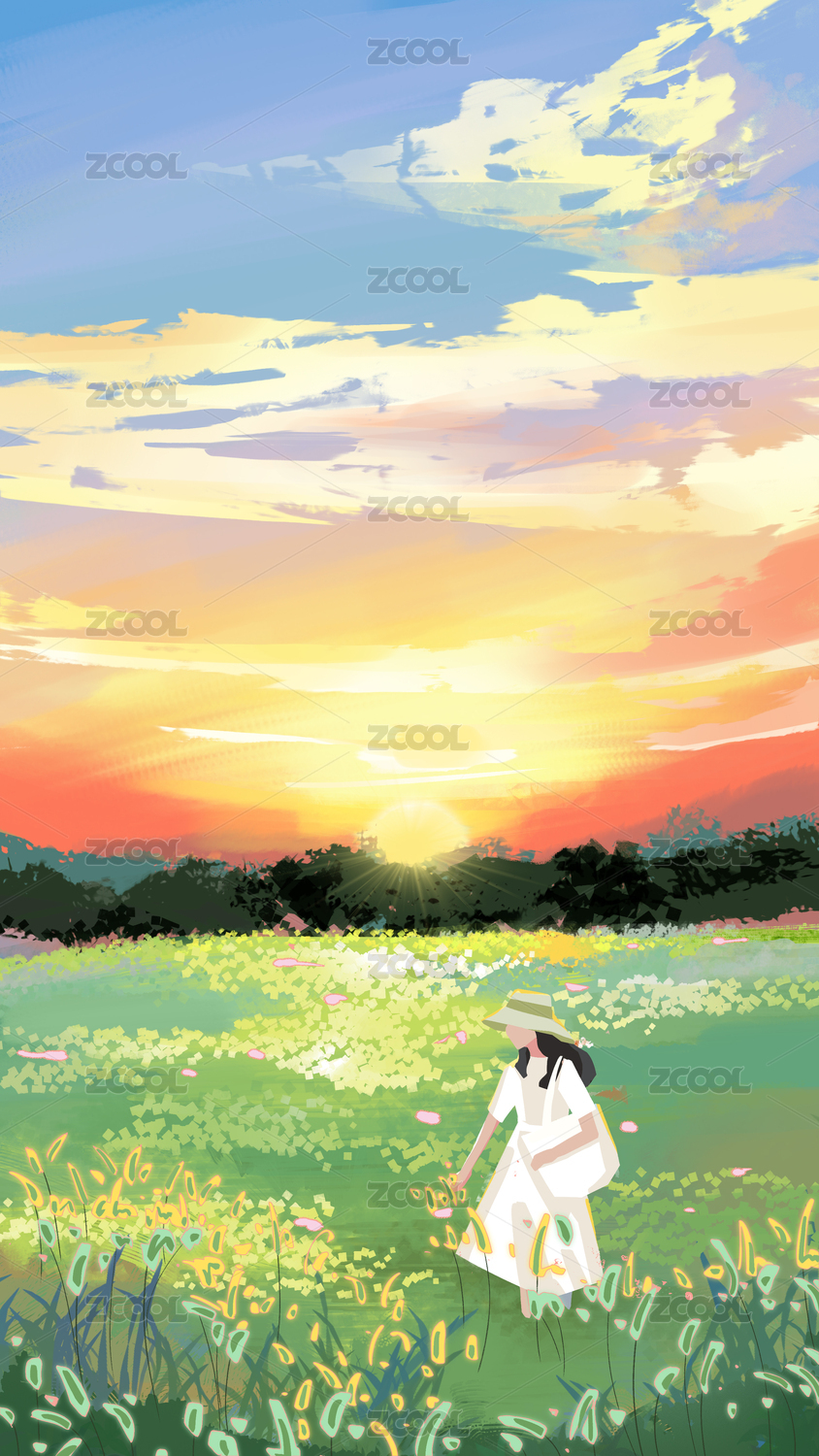 夏日傍晚黃昏手繪插畫