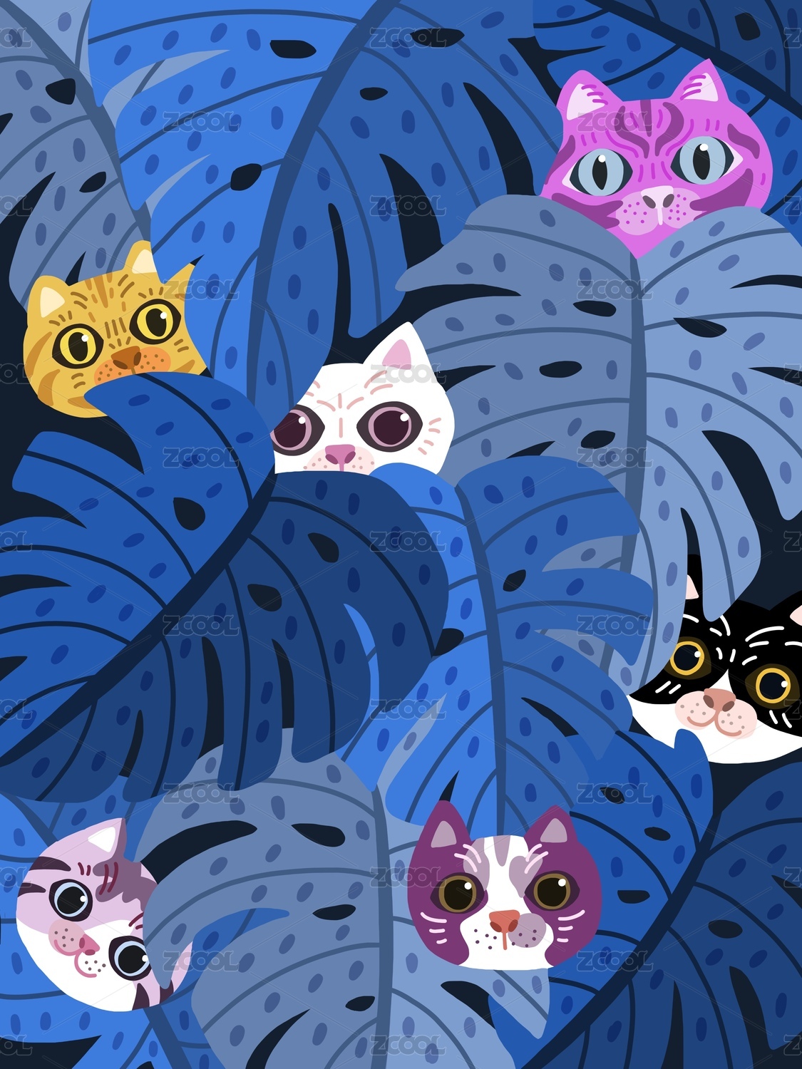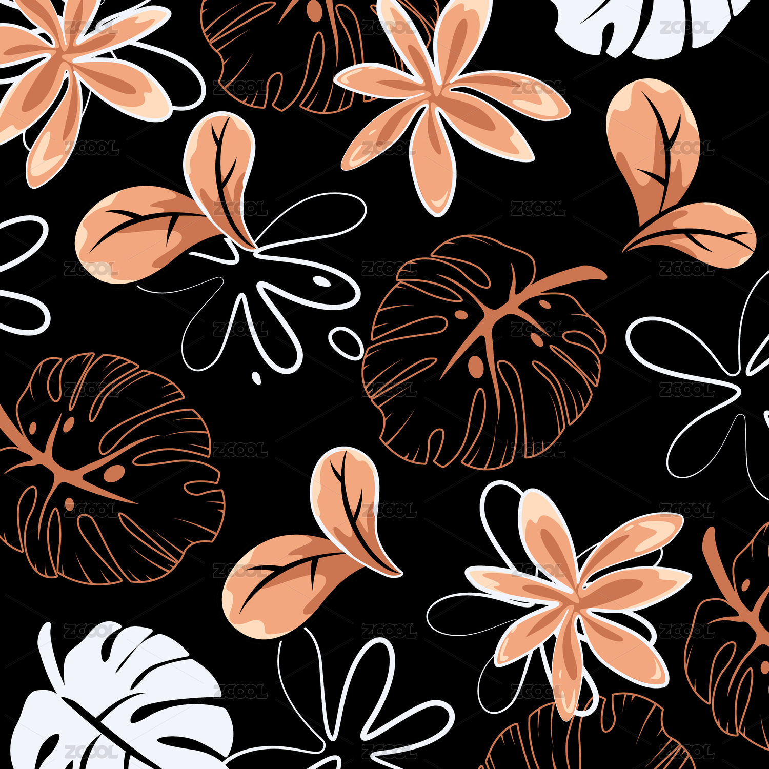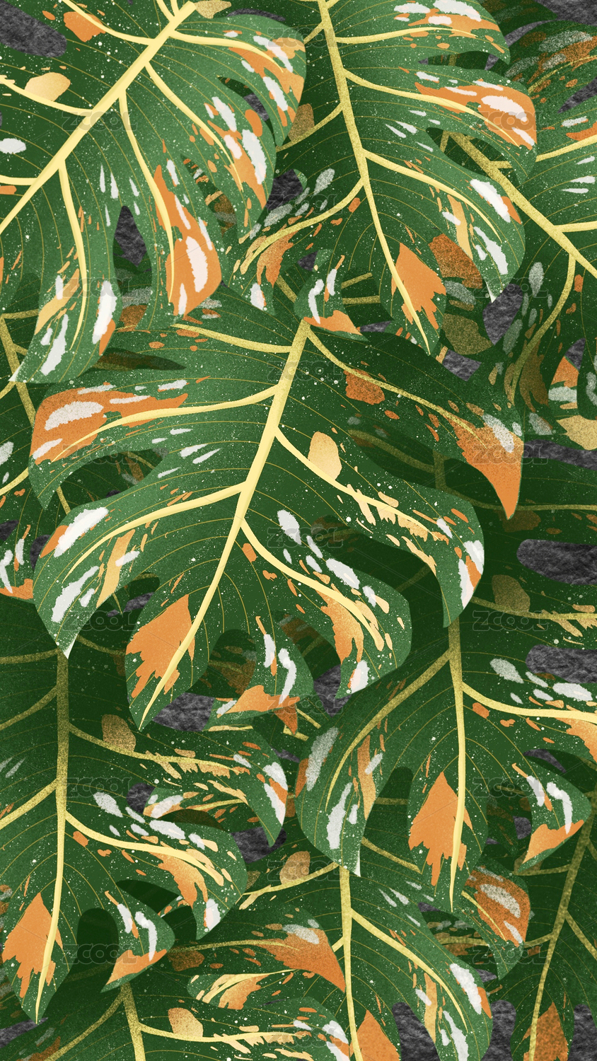 水墨條形背景里的長頸鹿紋龜背竹和豹紋菠蘿