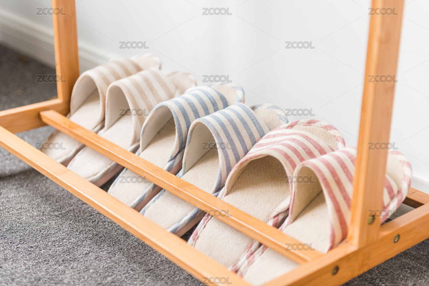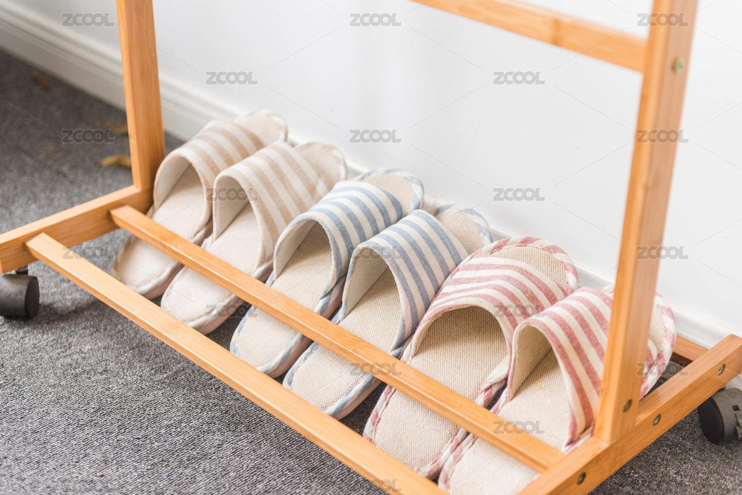 實木掛衣架下的家居條紋布拖鞋