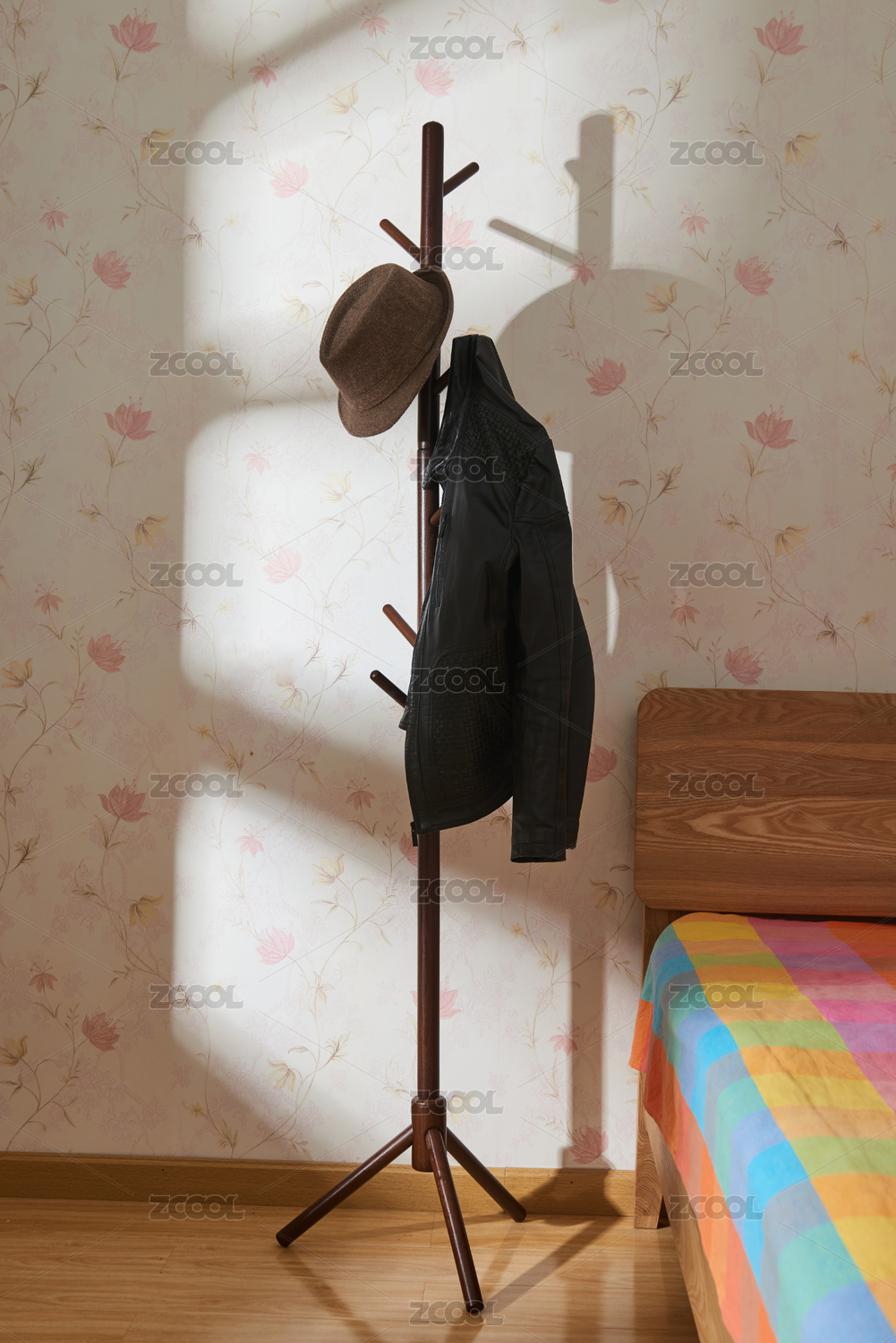掛著外套的枝形櫸木落地衣帽架