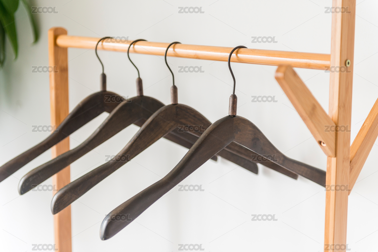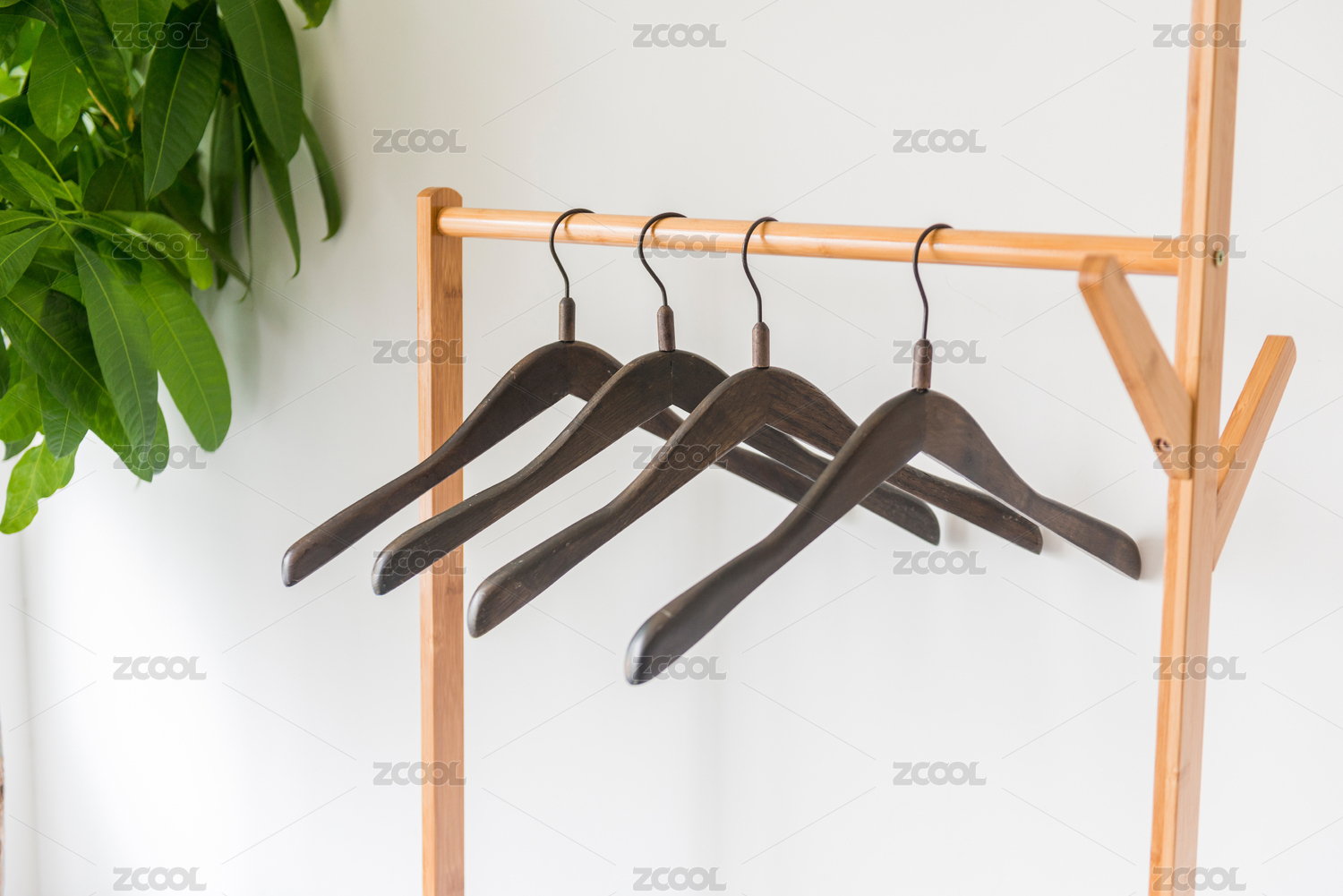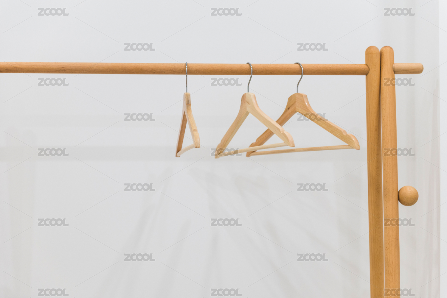 白色墻壁前的實木晾衣架和掛衣架