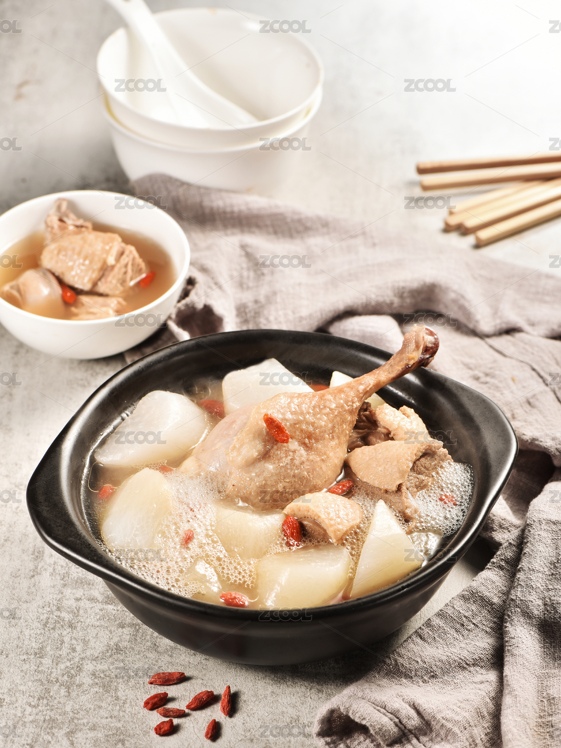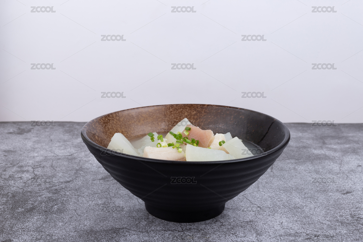 灰色背景上瓷碗里的白蘿卜湯