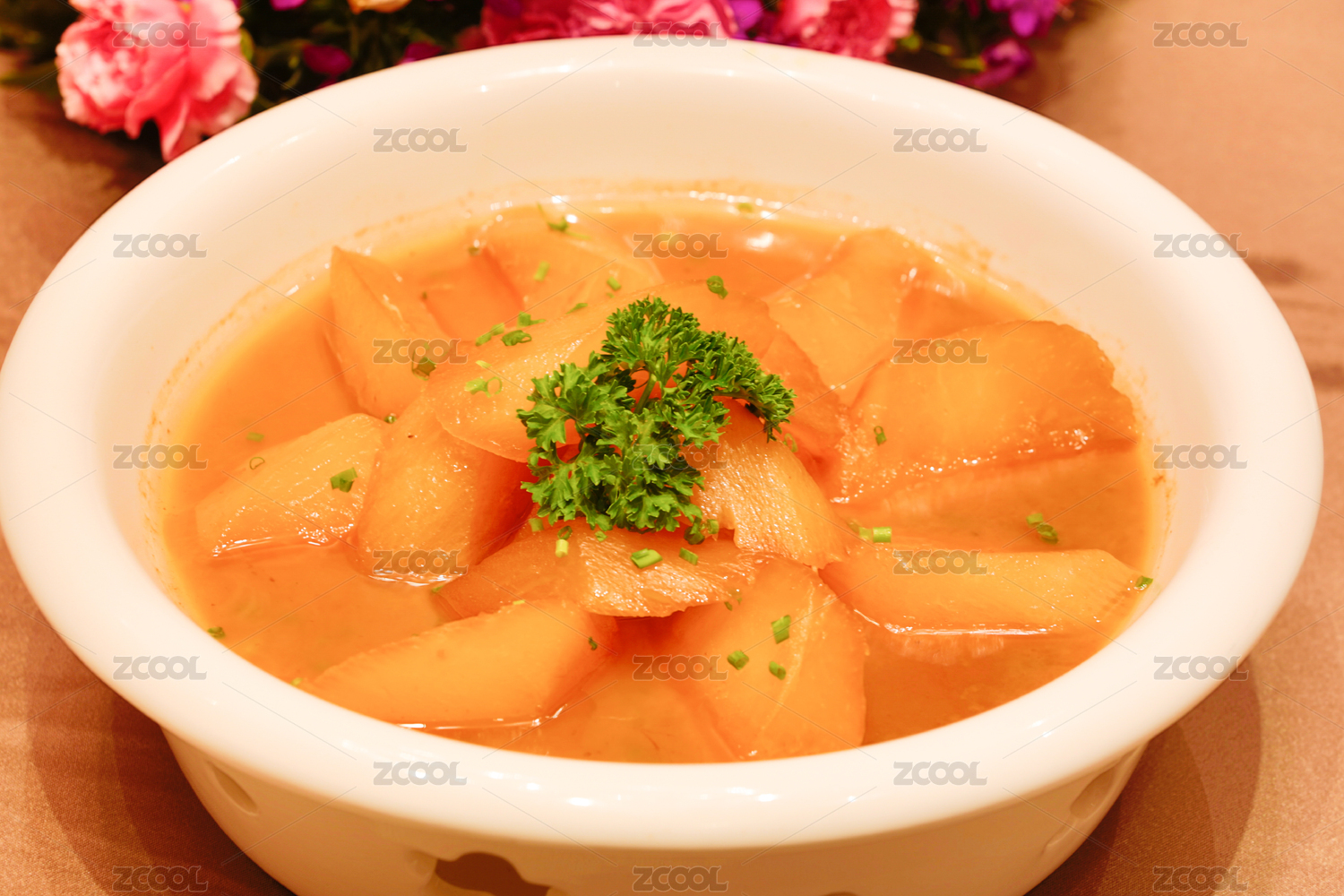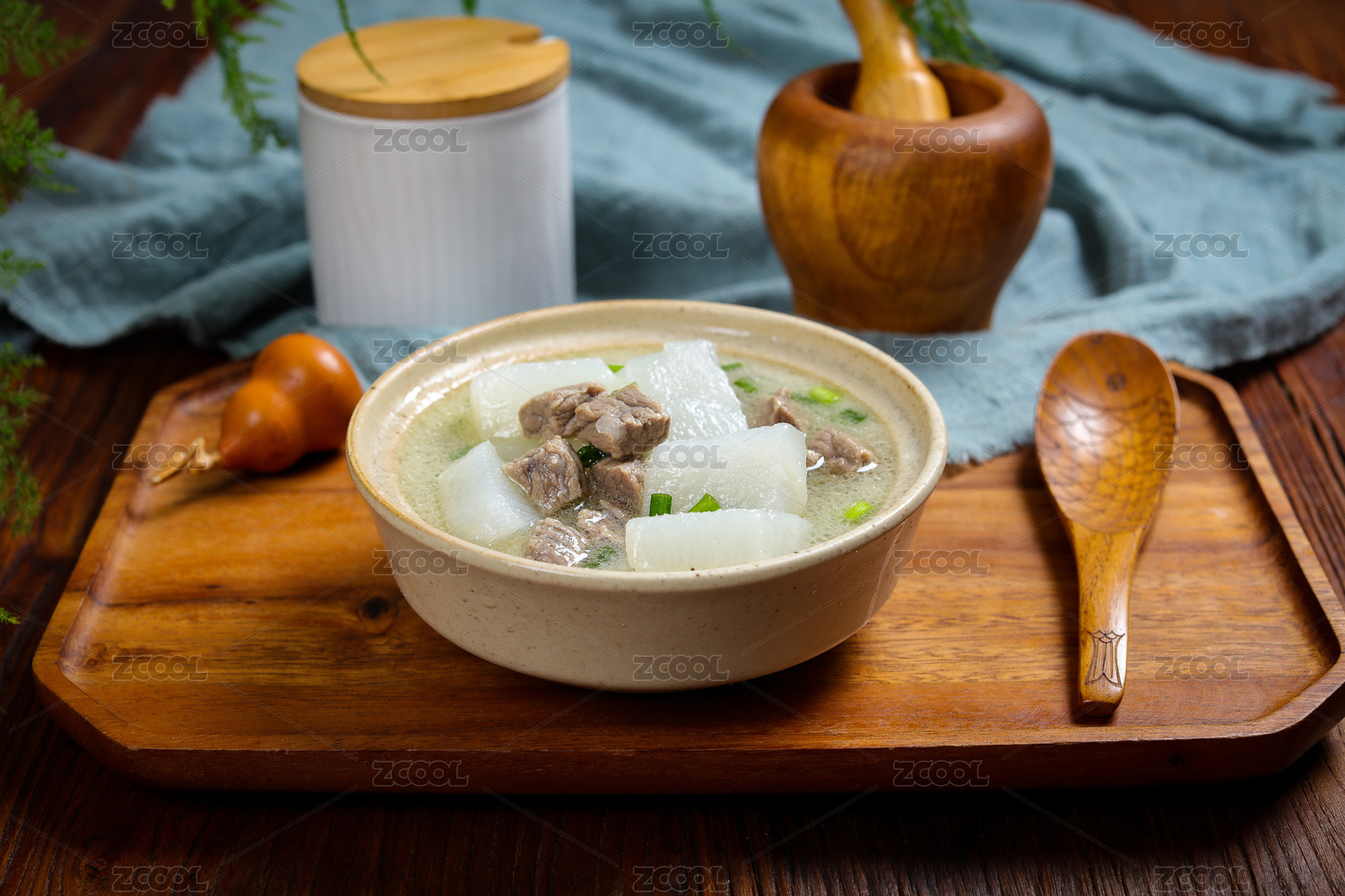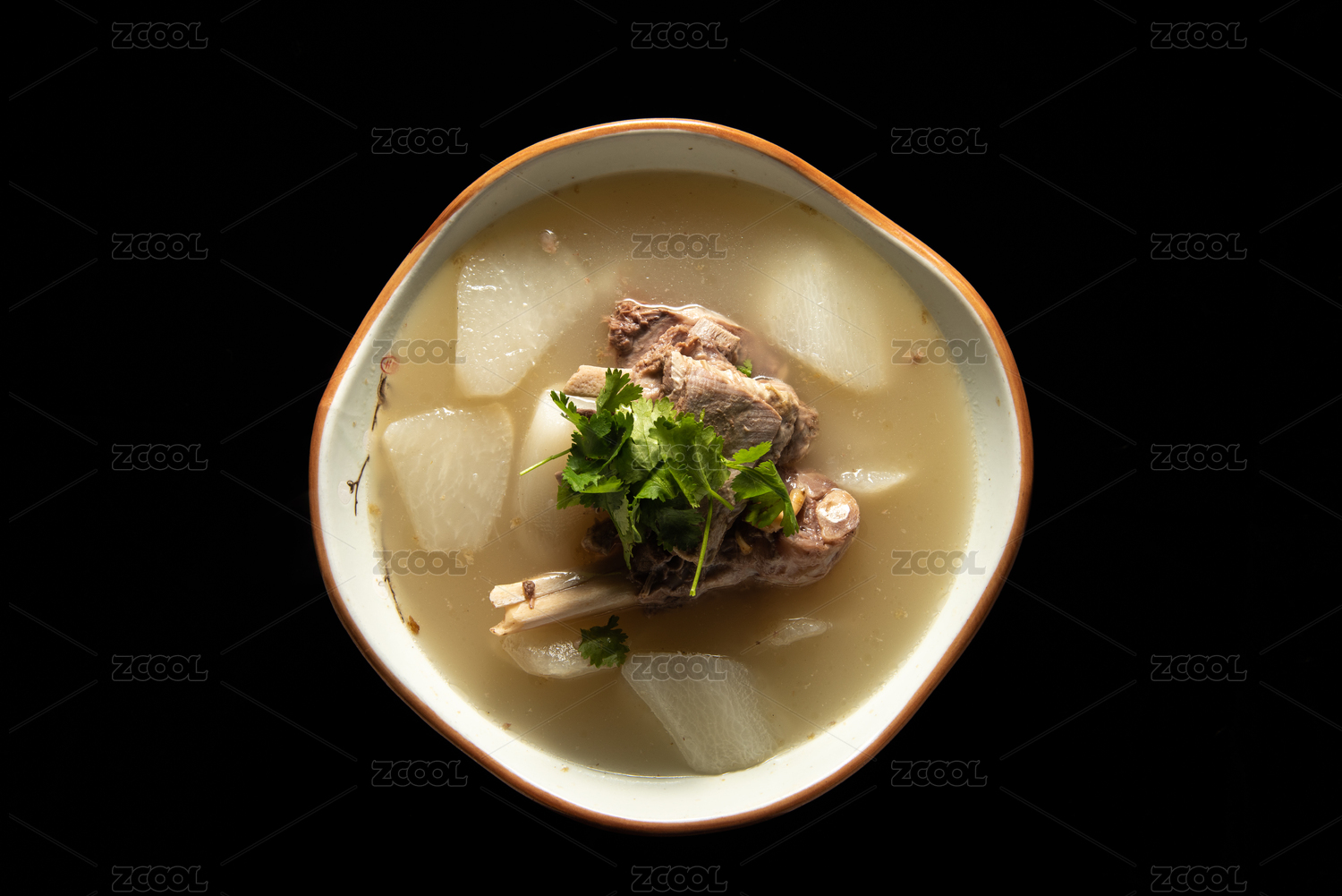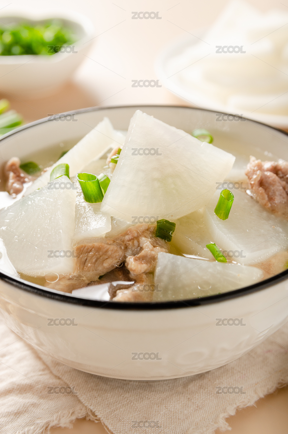 瓷碗里的豬肉蘿卜湯