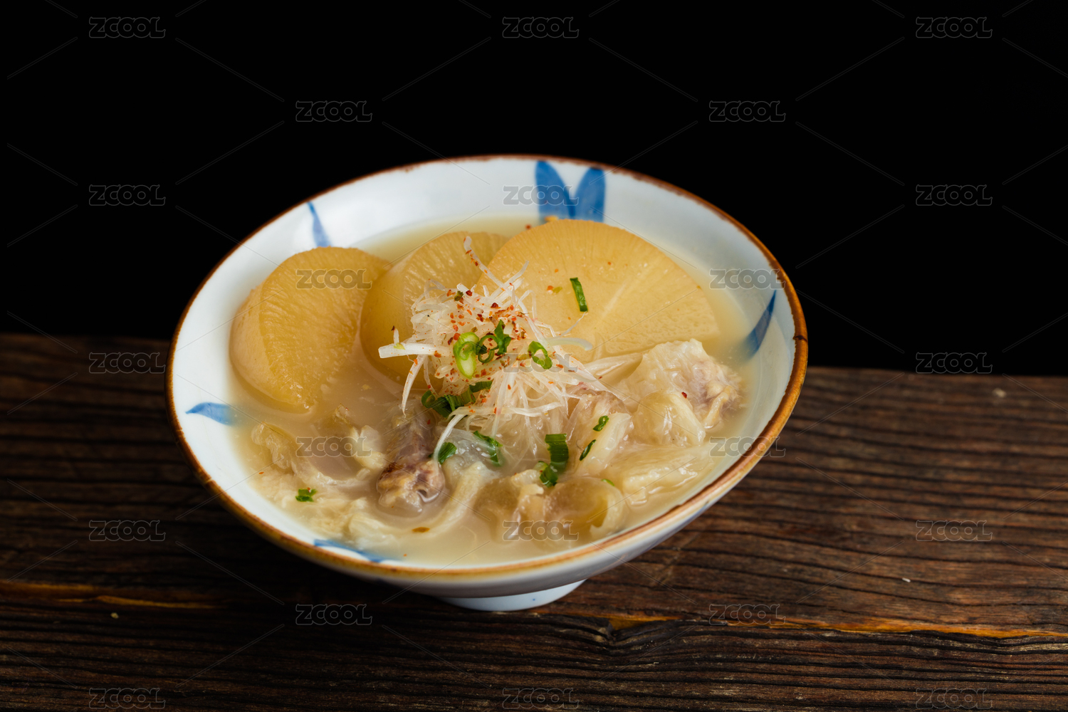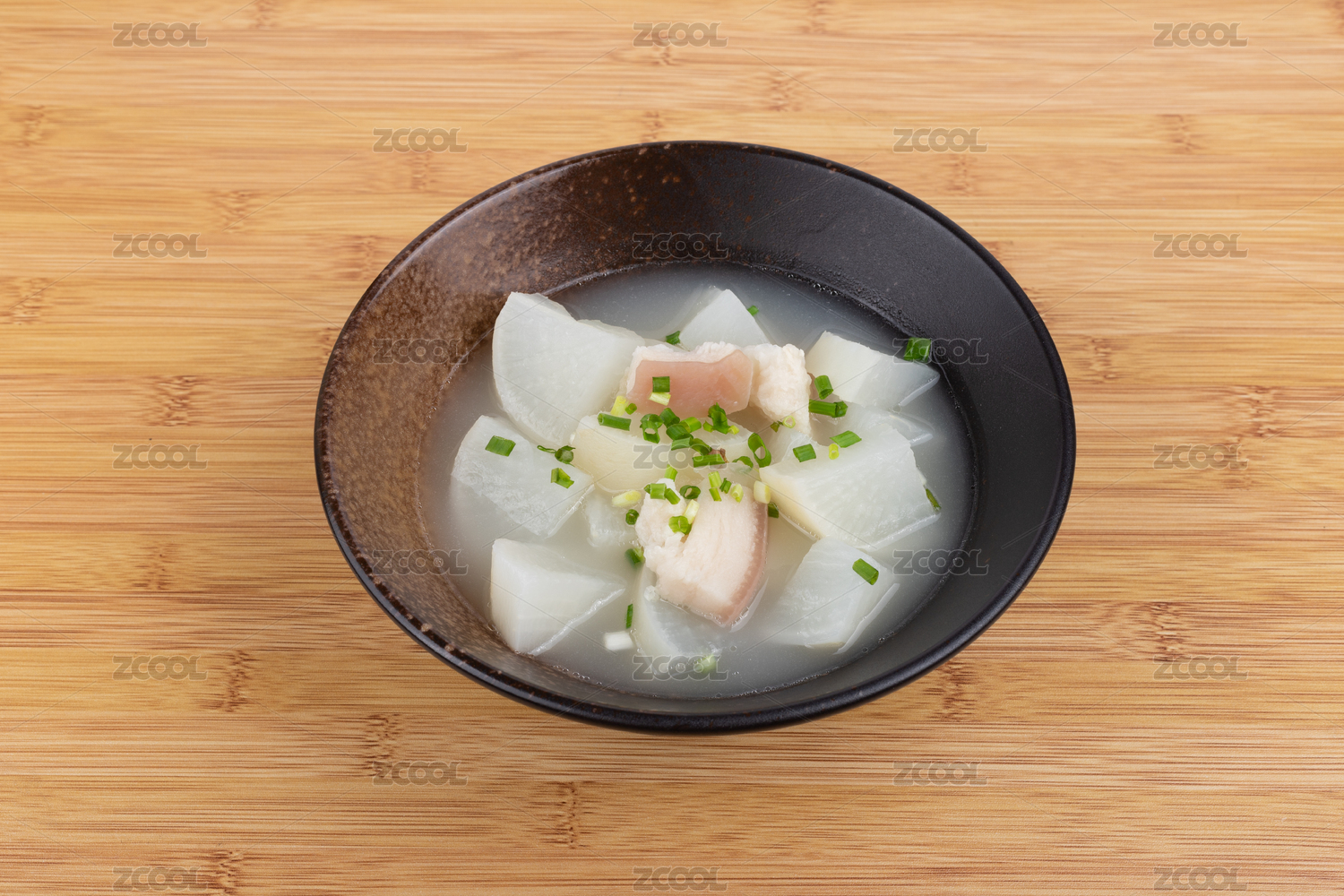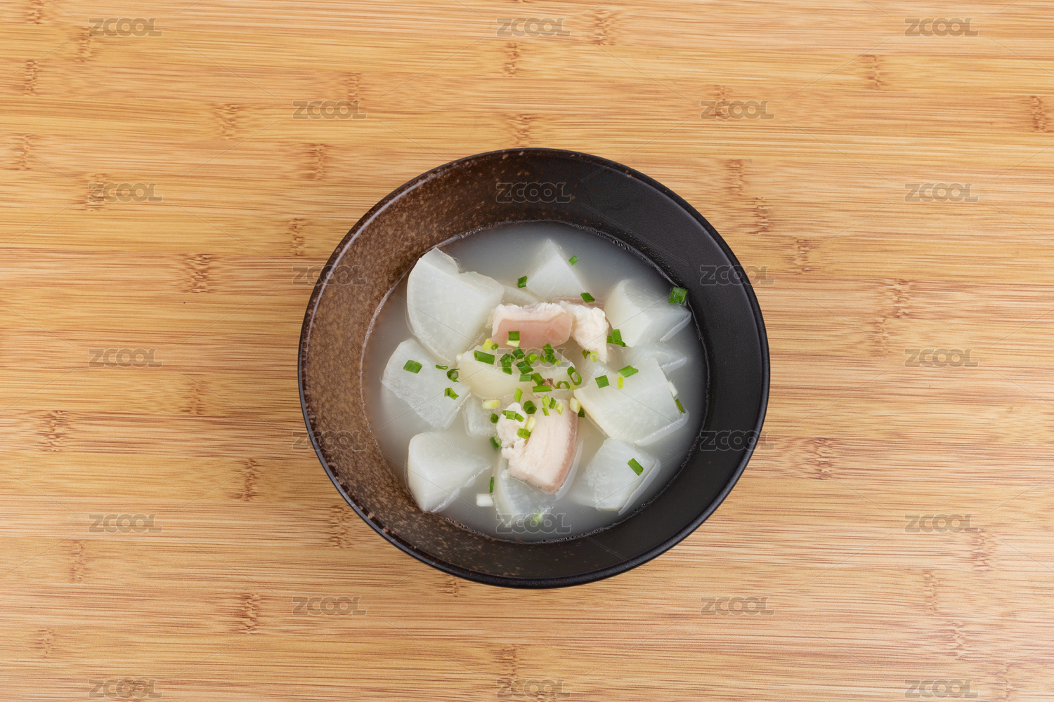 深色瓷碗里盛放著的白蘿卜湯