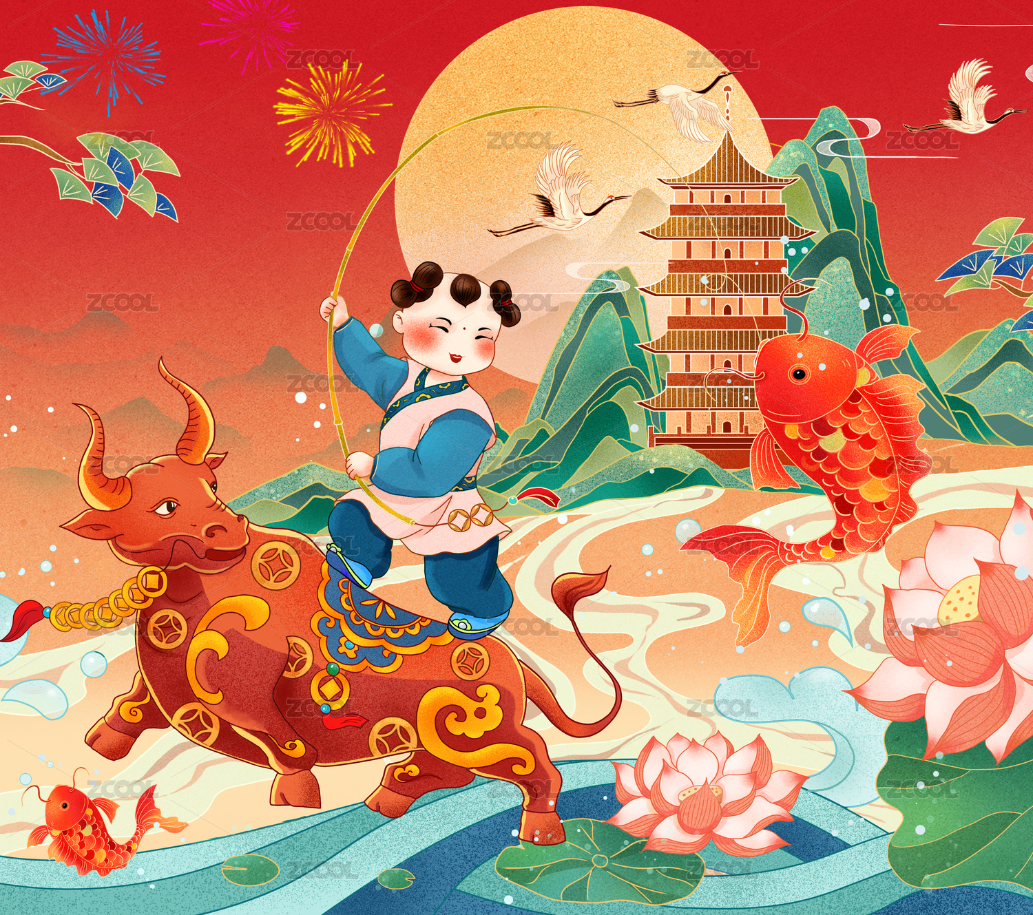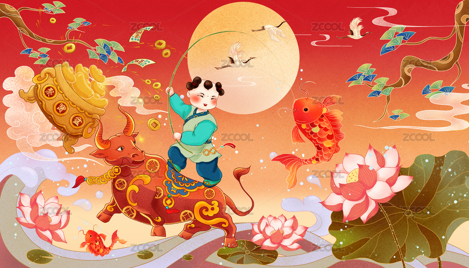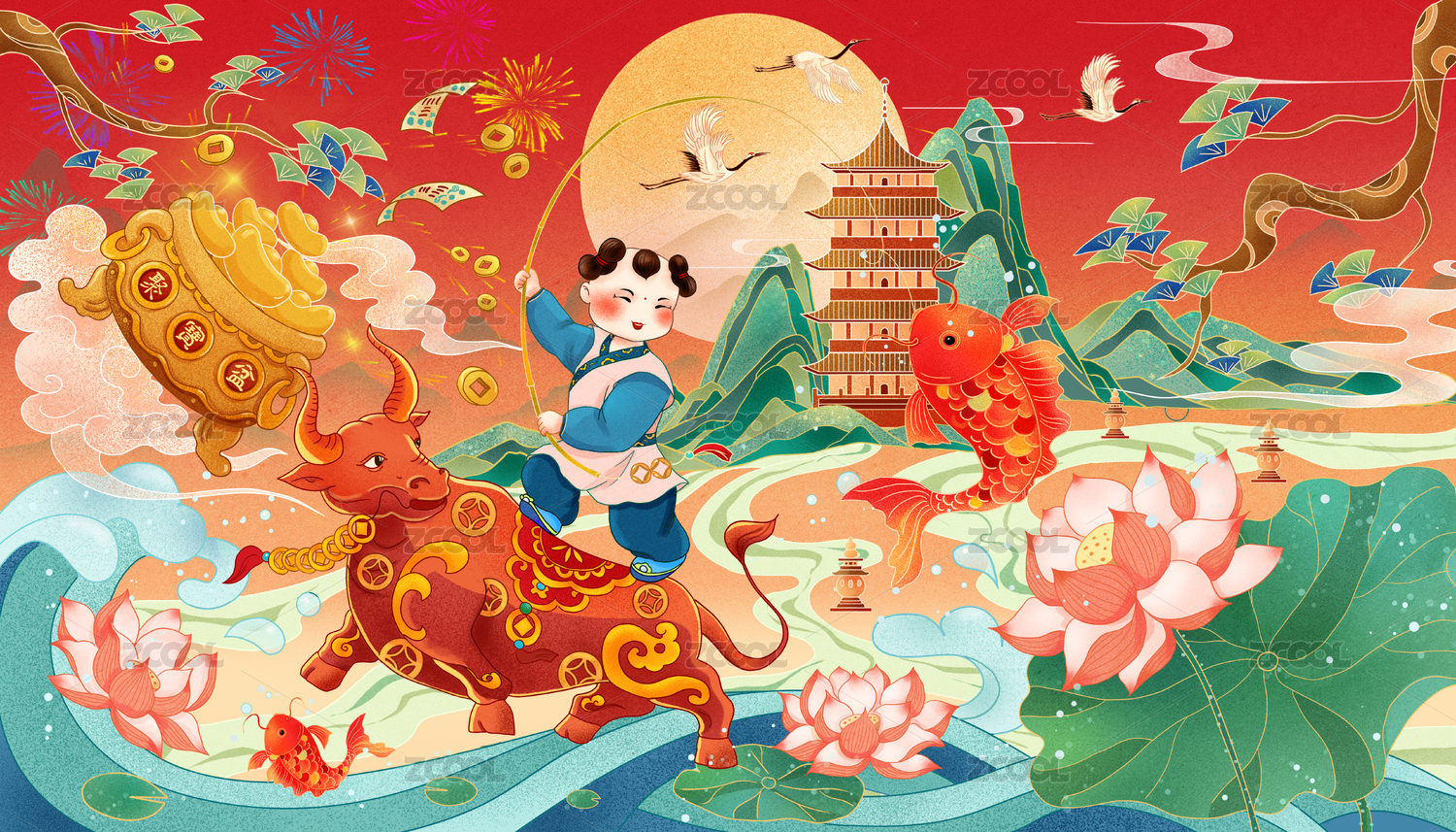 牛年插畫騎牛釣魚的散財(cái)童子
