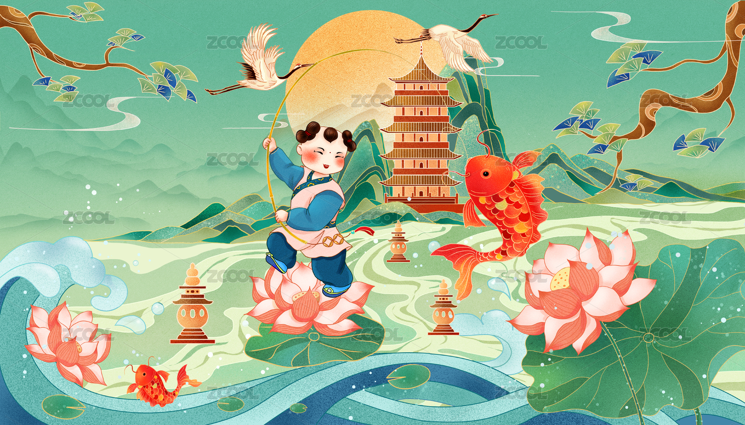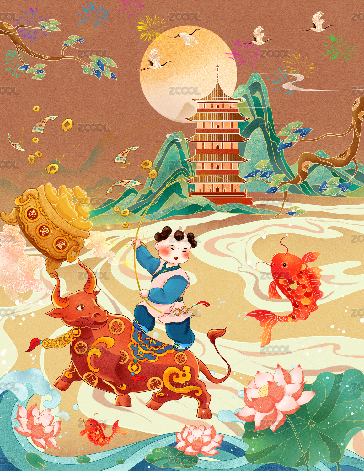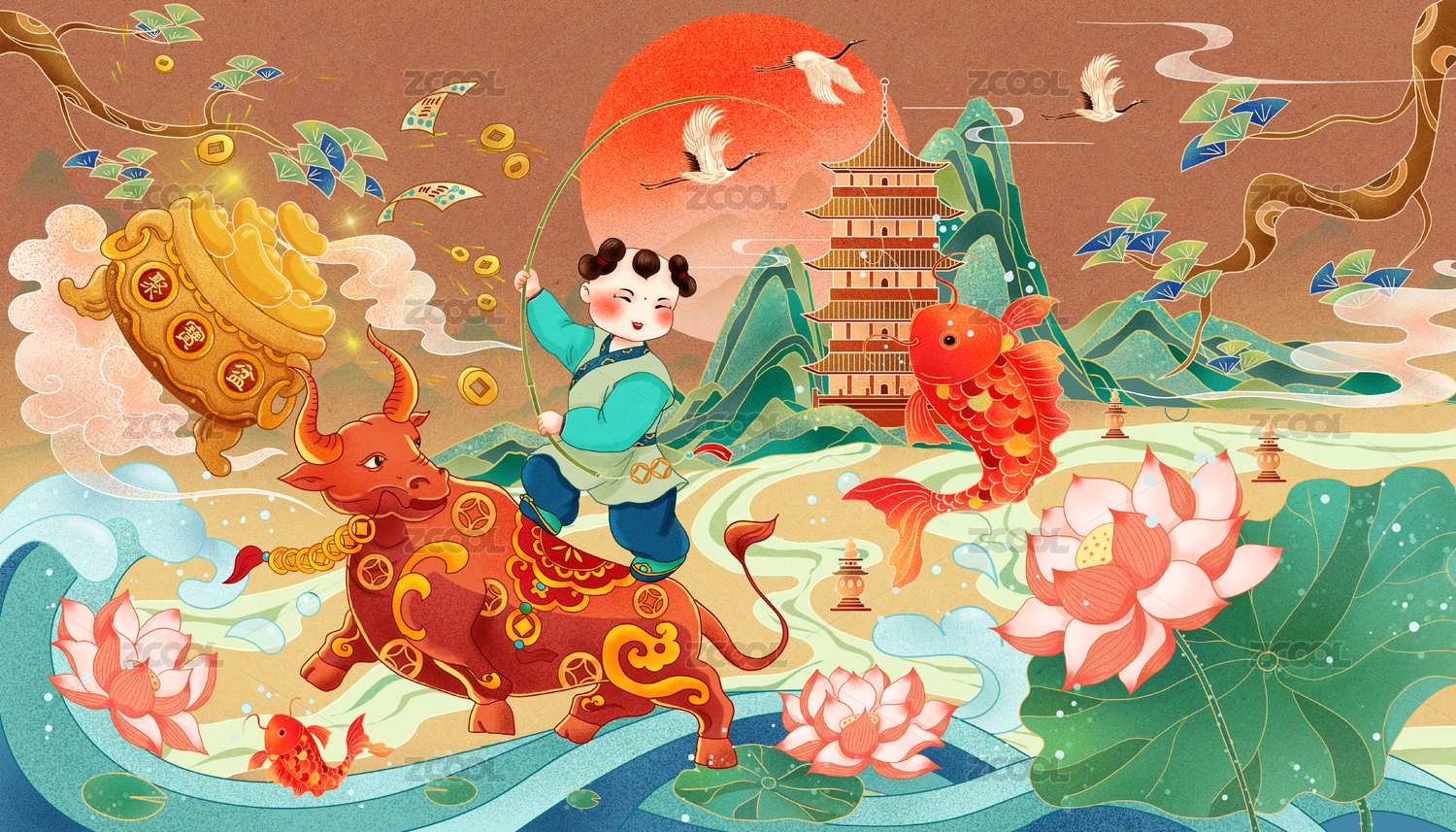牛年插畫騎牛釣魚的散財(cái)童子