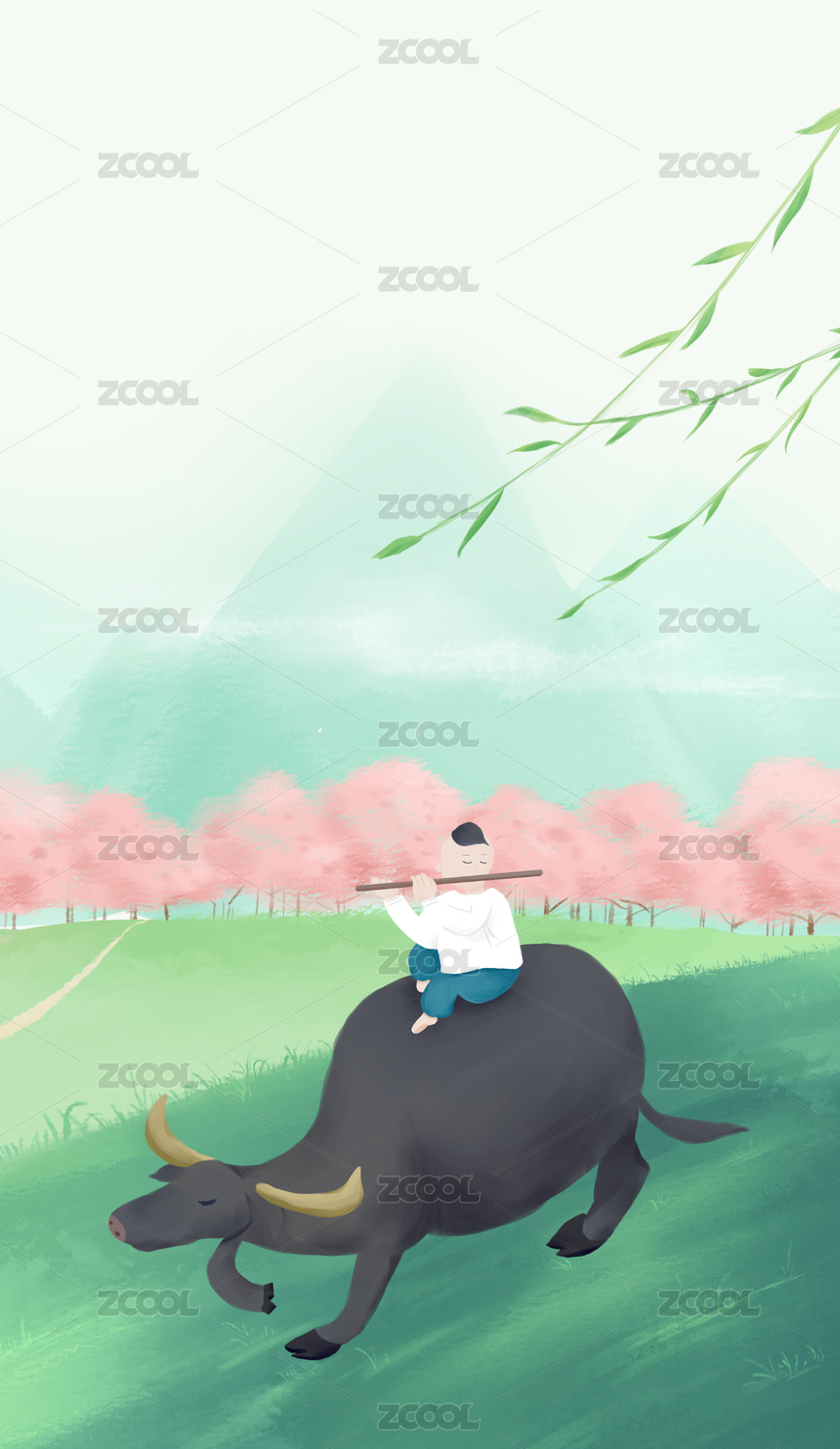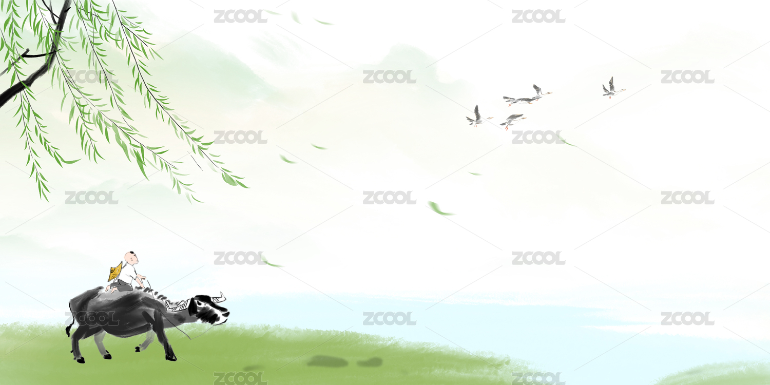水墨中國(guó)畫古典詩(shī)詞插圖春天垂柳下騎牛的牧童