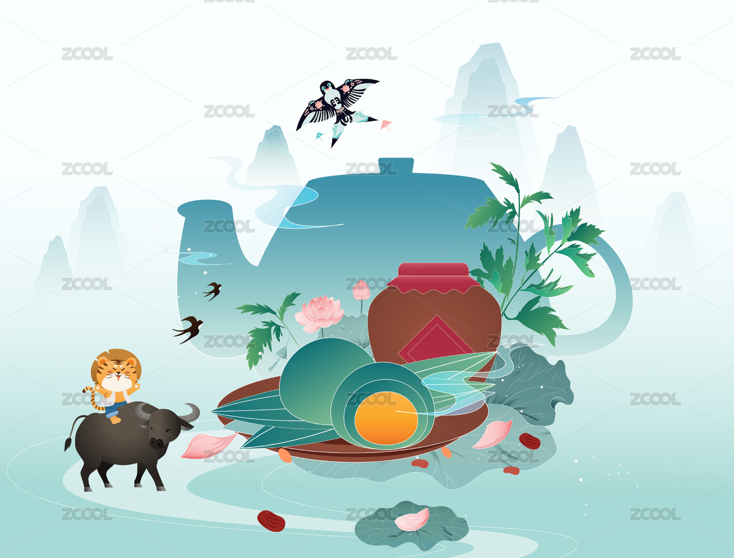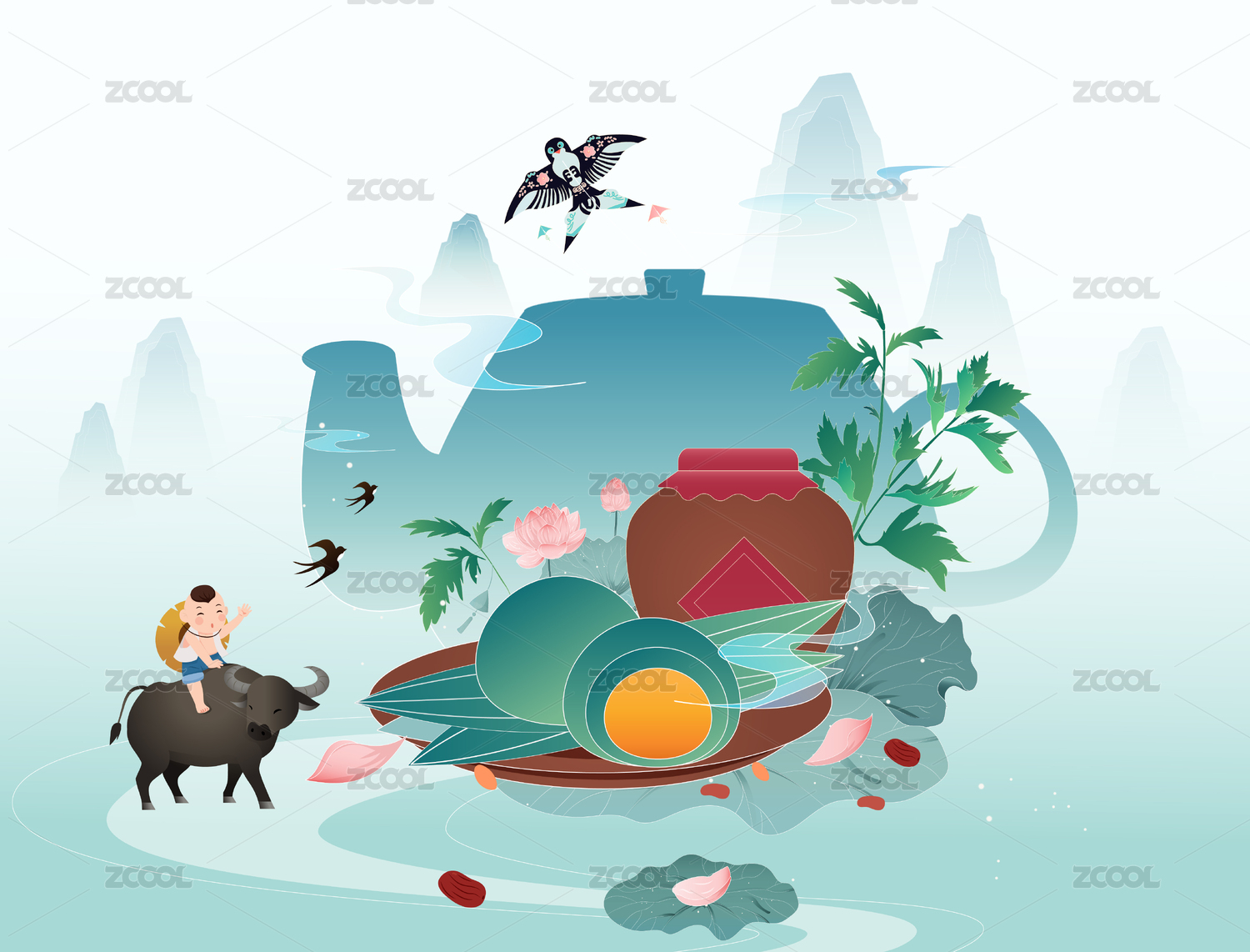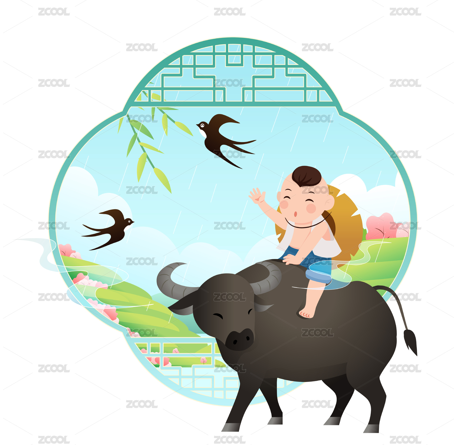 國(guó)潮國(guó)風(fēng)牧童騎牛的清明青團(tuán)矢量插畫
