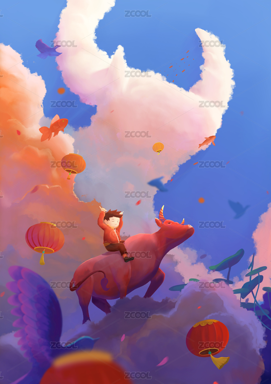騎牛的男孩兒在云端上幻想