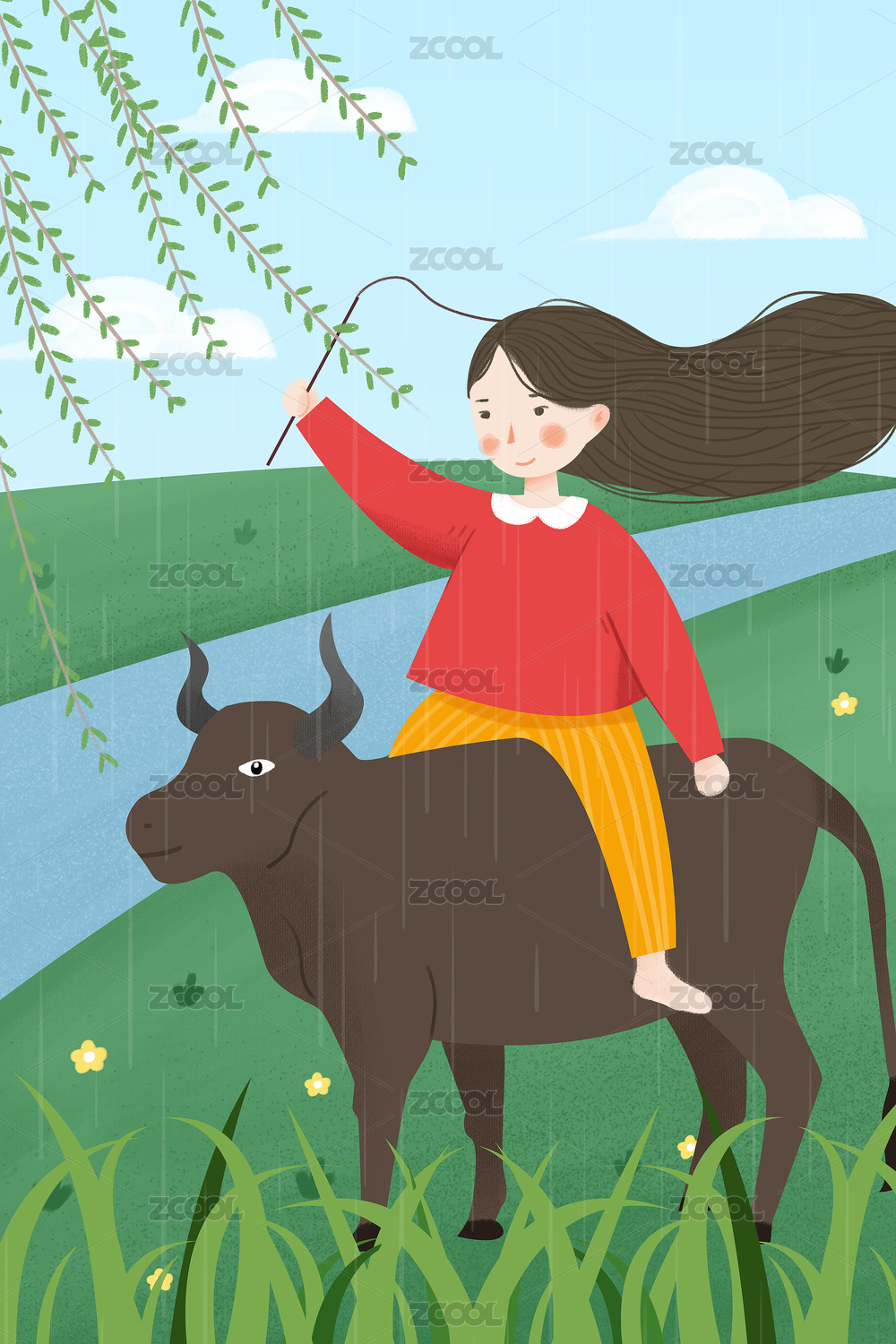 文藝清新谷雨清明節(jié)氣女孩騎牛揮鞭春天插畫