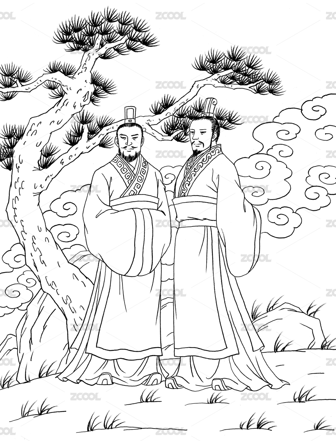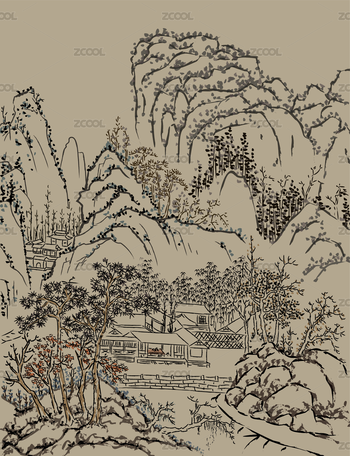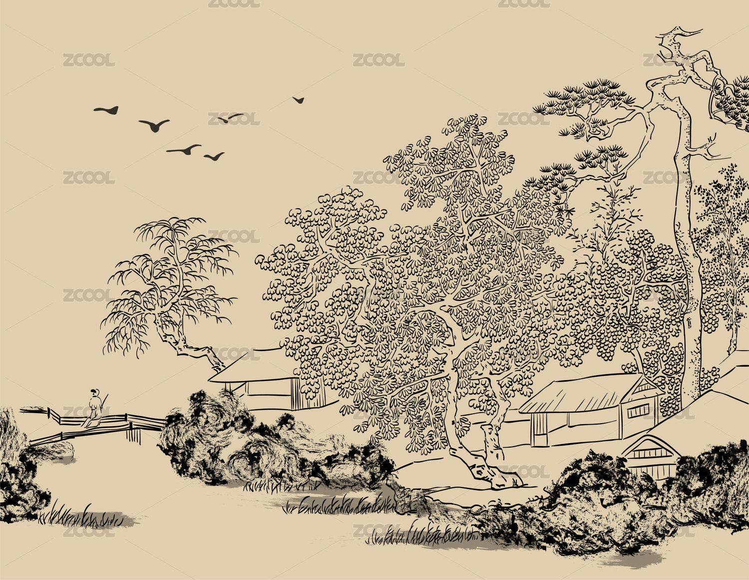 傳統(tǒng)水墨白描松柏房舍線描圖