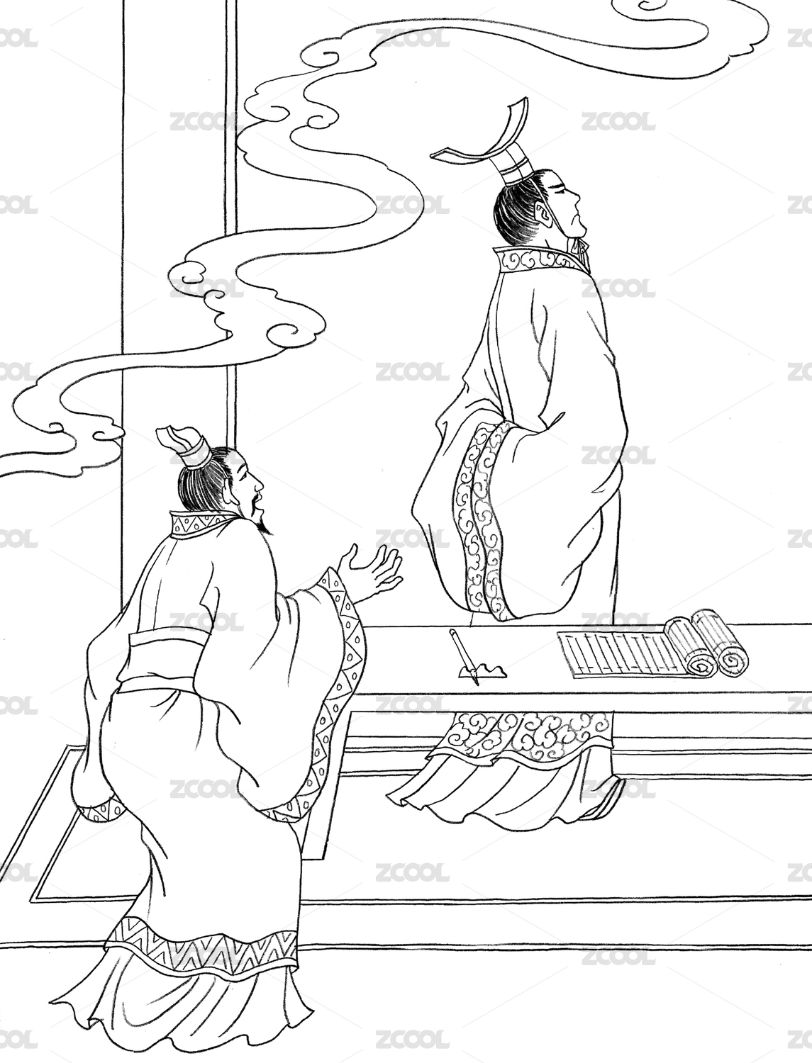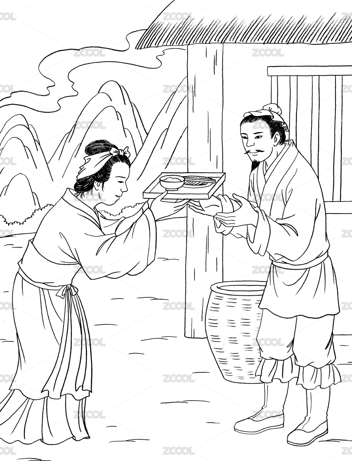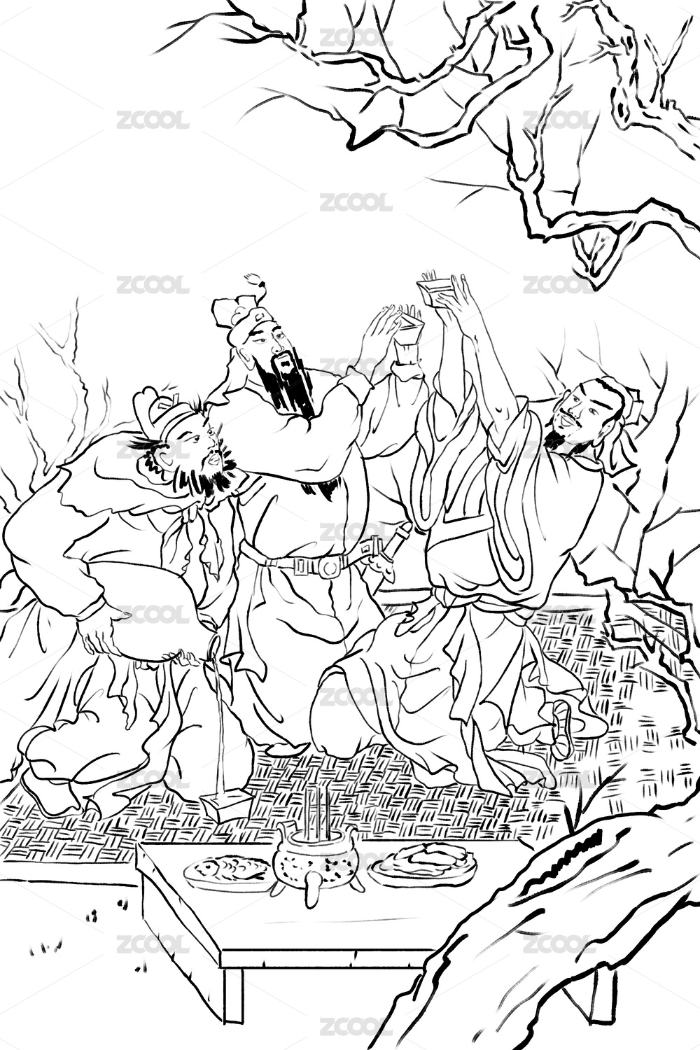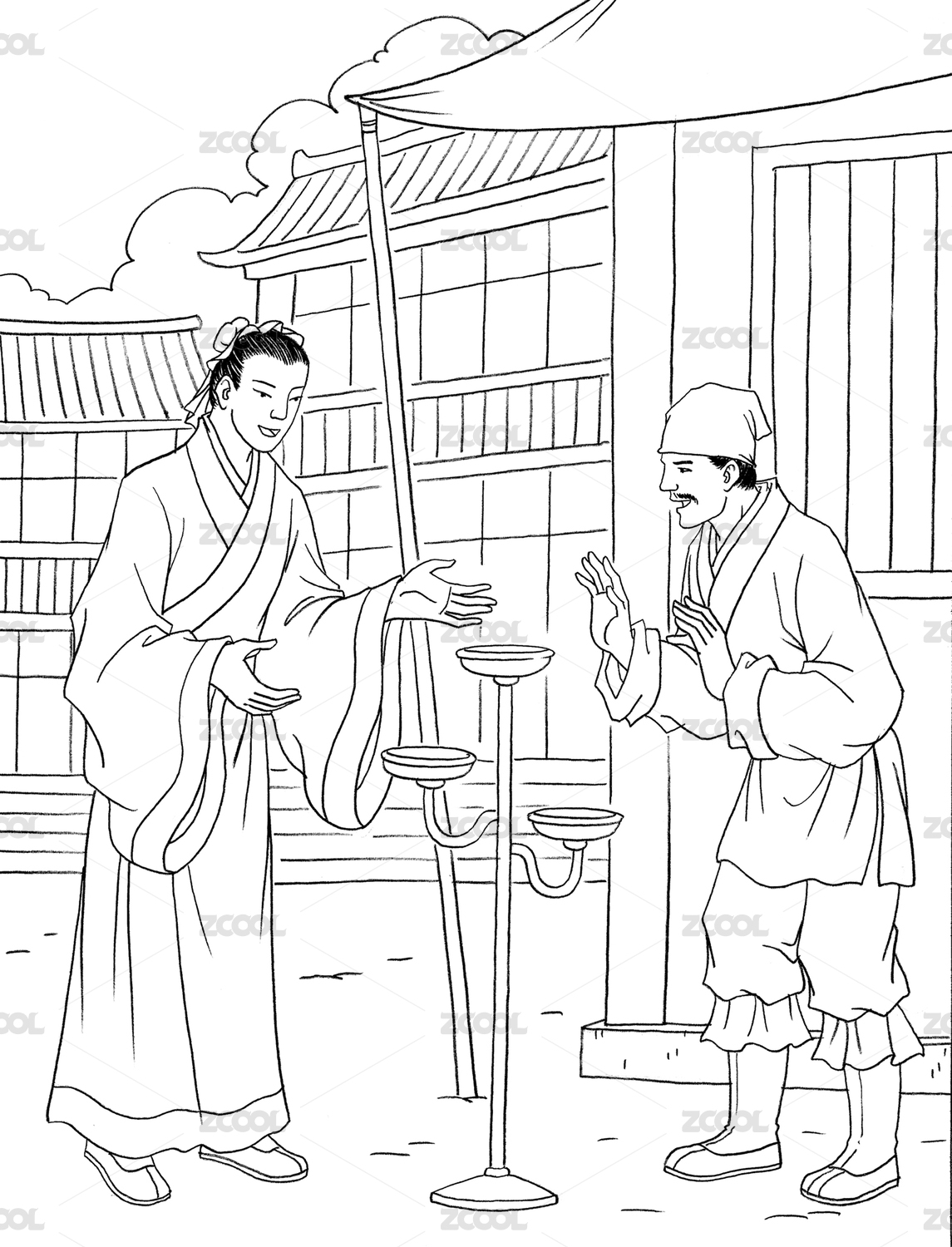 傳統(tǒng)水墨白描松柏房舍線描圖