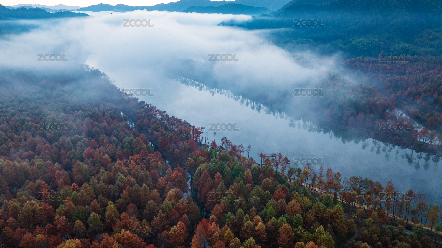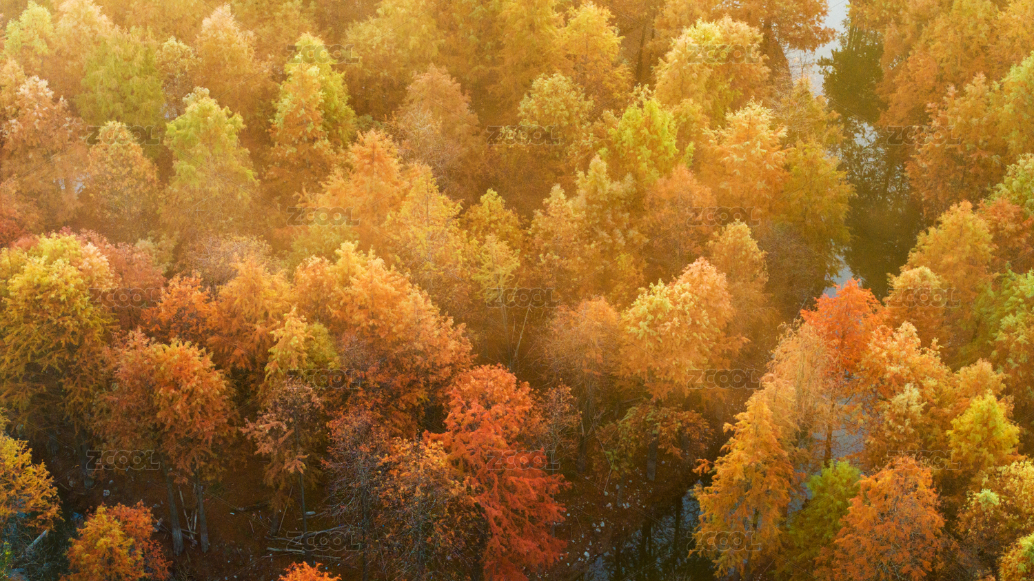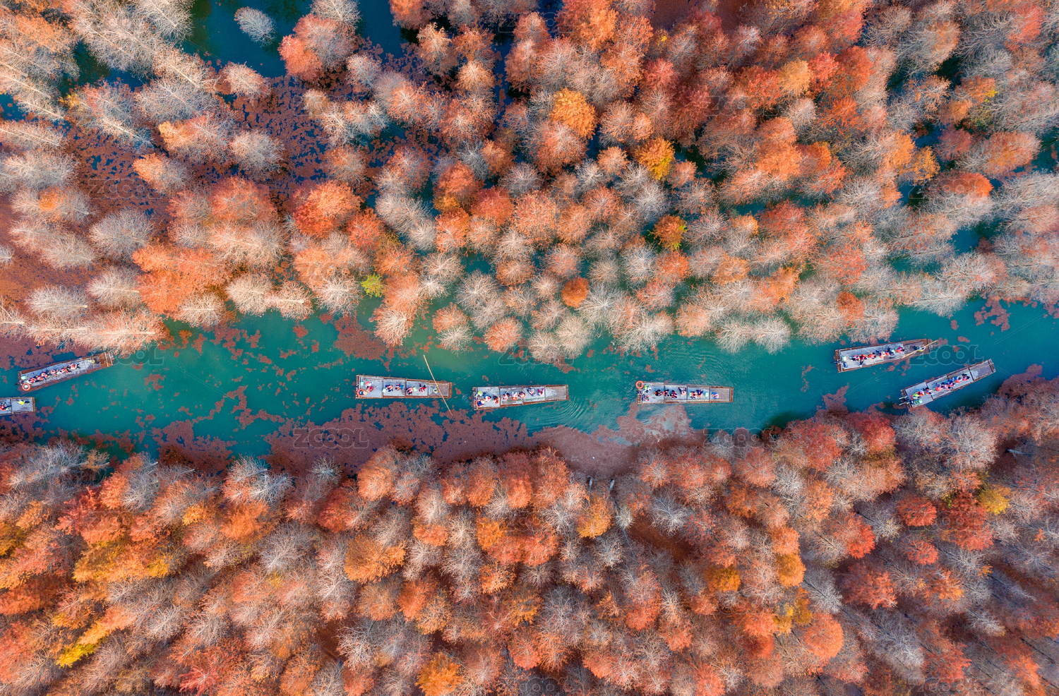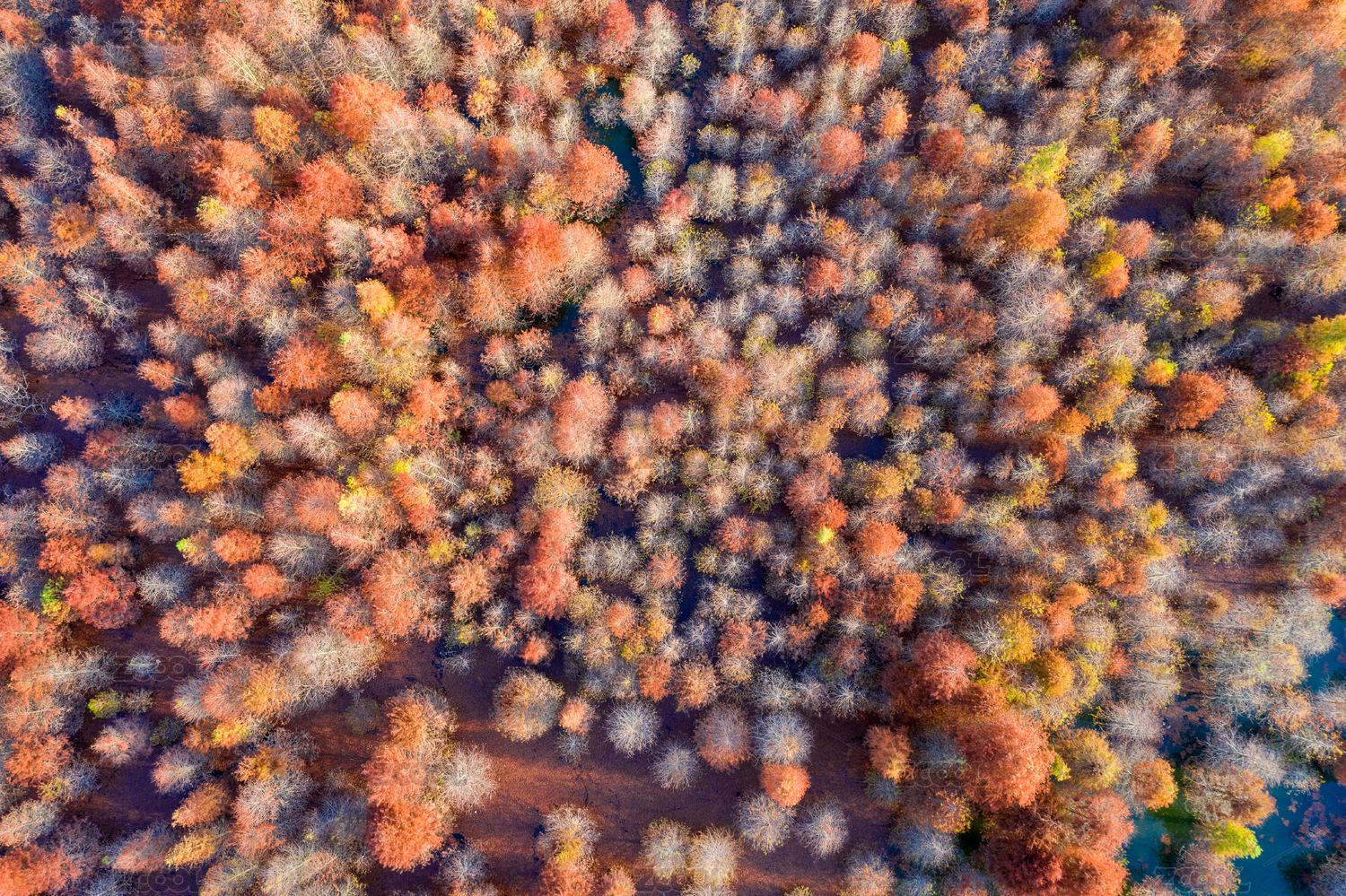 航拍中國(guó)安徽宣城寧國(guó)方塘秋天水上落羽杉