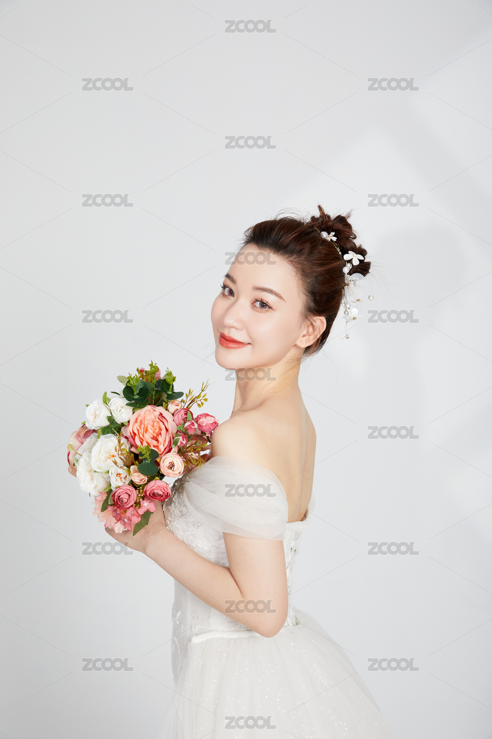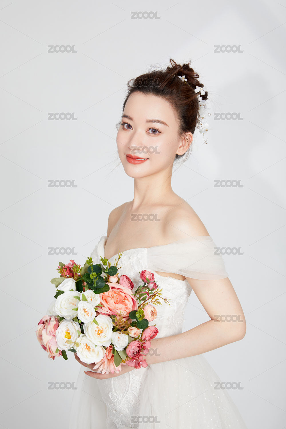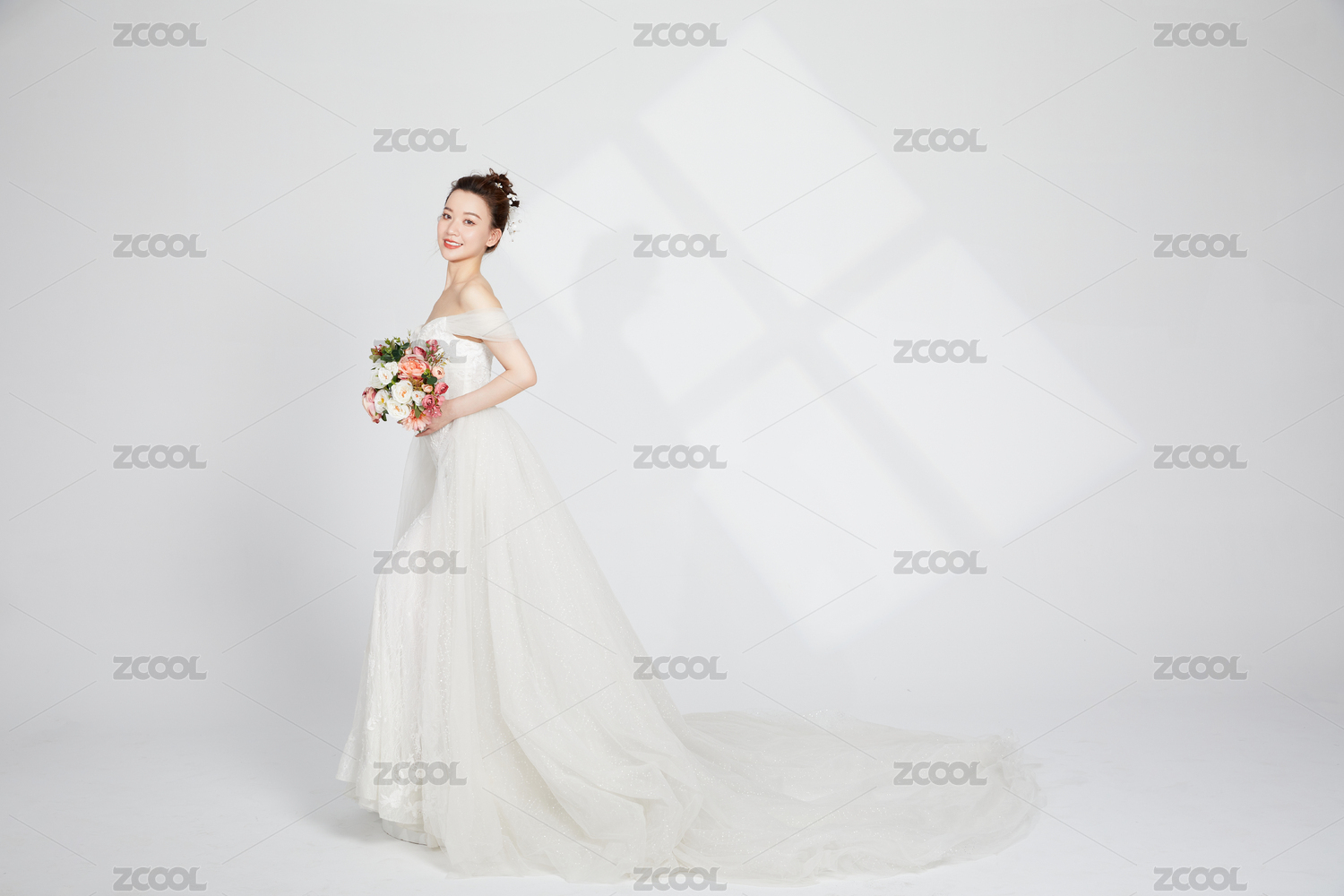 手捧鮮花身穿白色婚紗的新娘站在窗戶邊