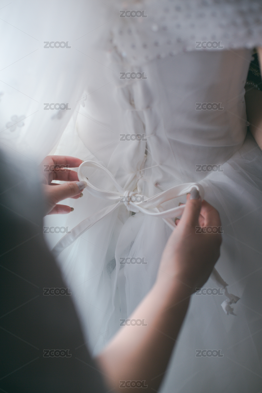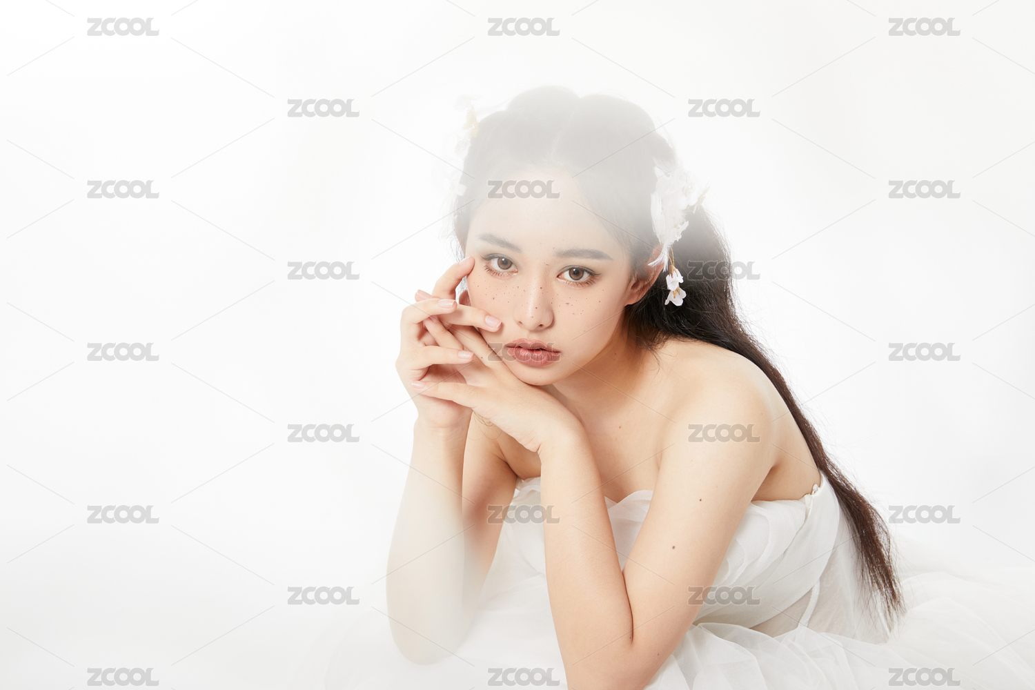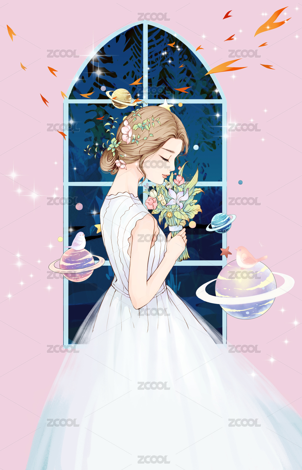手捧鮮花身穿白色婚紗的新娘站在窗戶邊