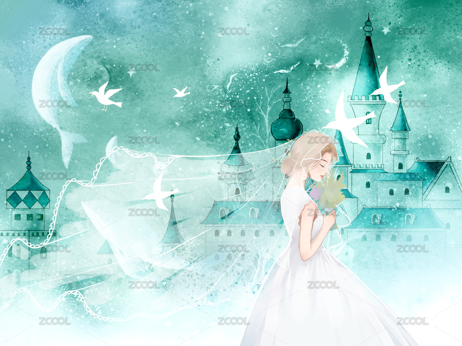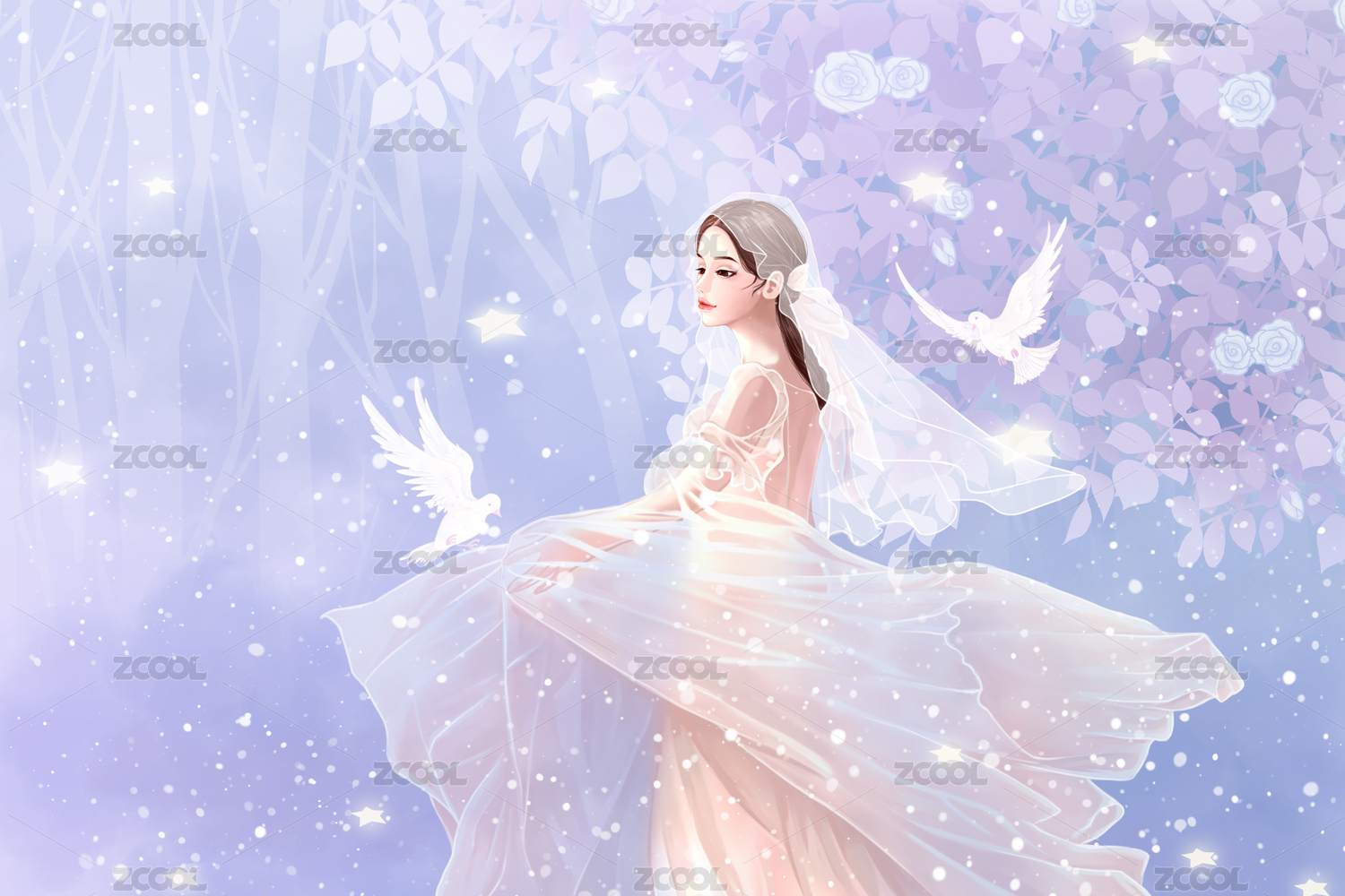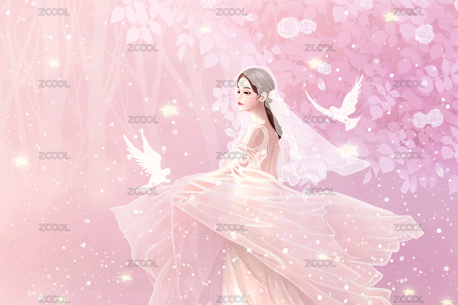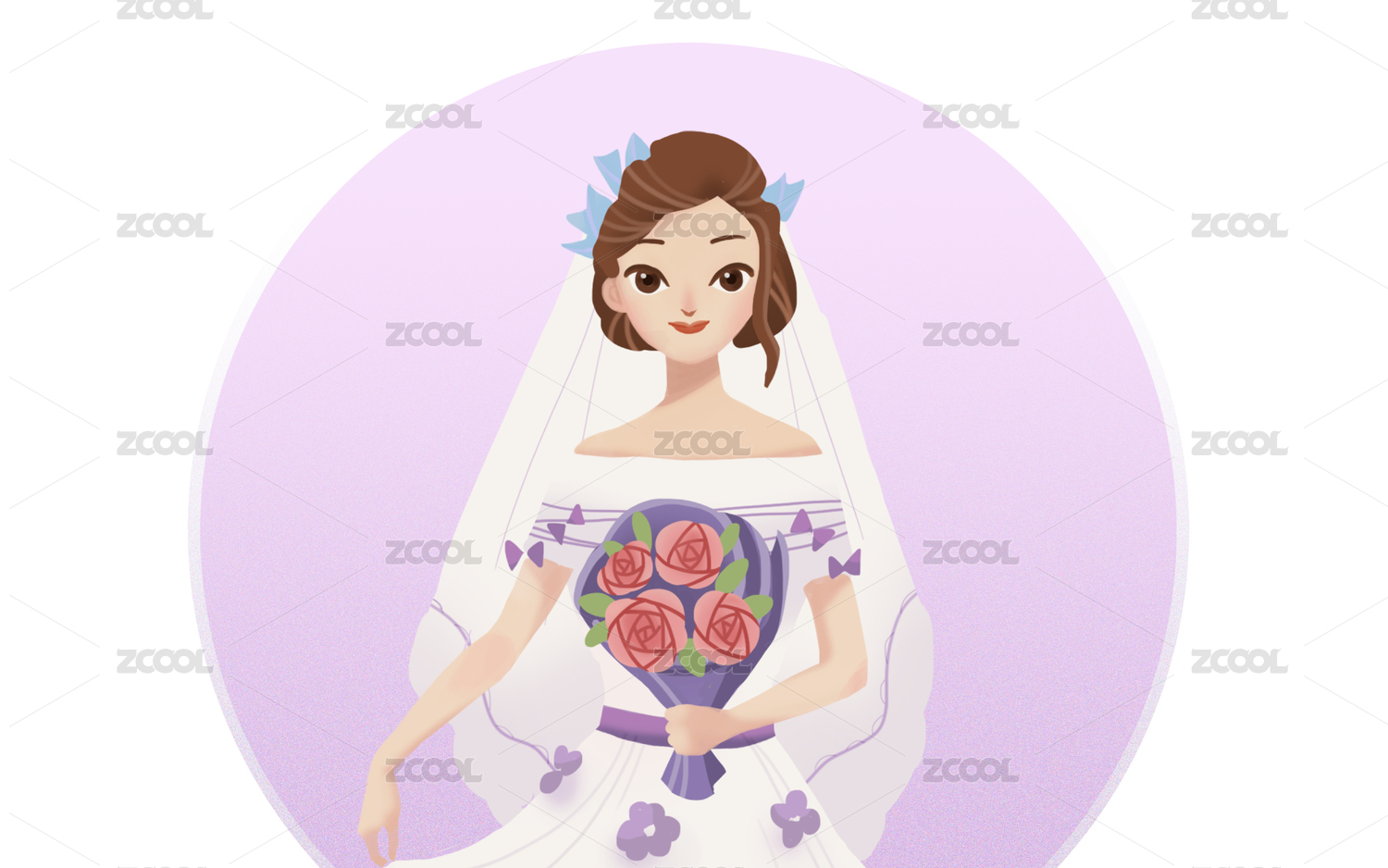 穿著白色婚紗拿著玫瑰花束的新娘 笑容燦爛 手繪插畫