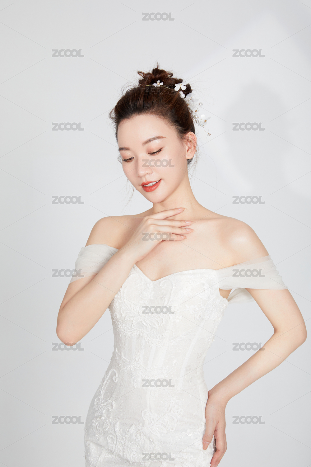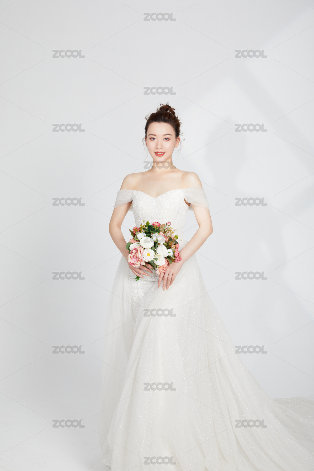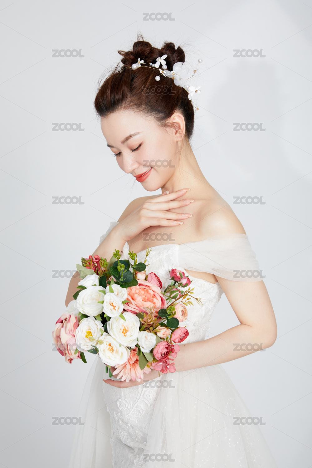 穿白色婚紗的新娘拿著手捧花低頭微笑