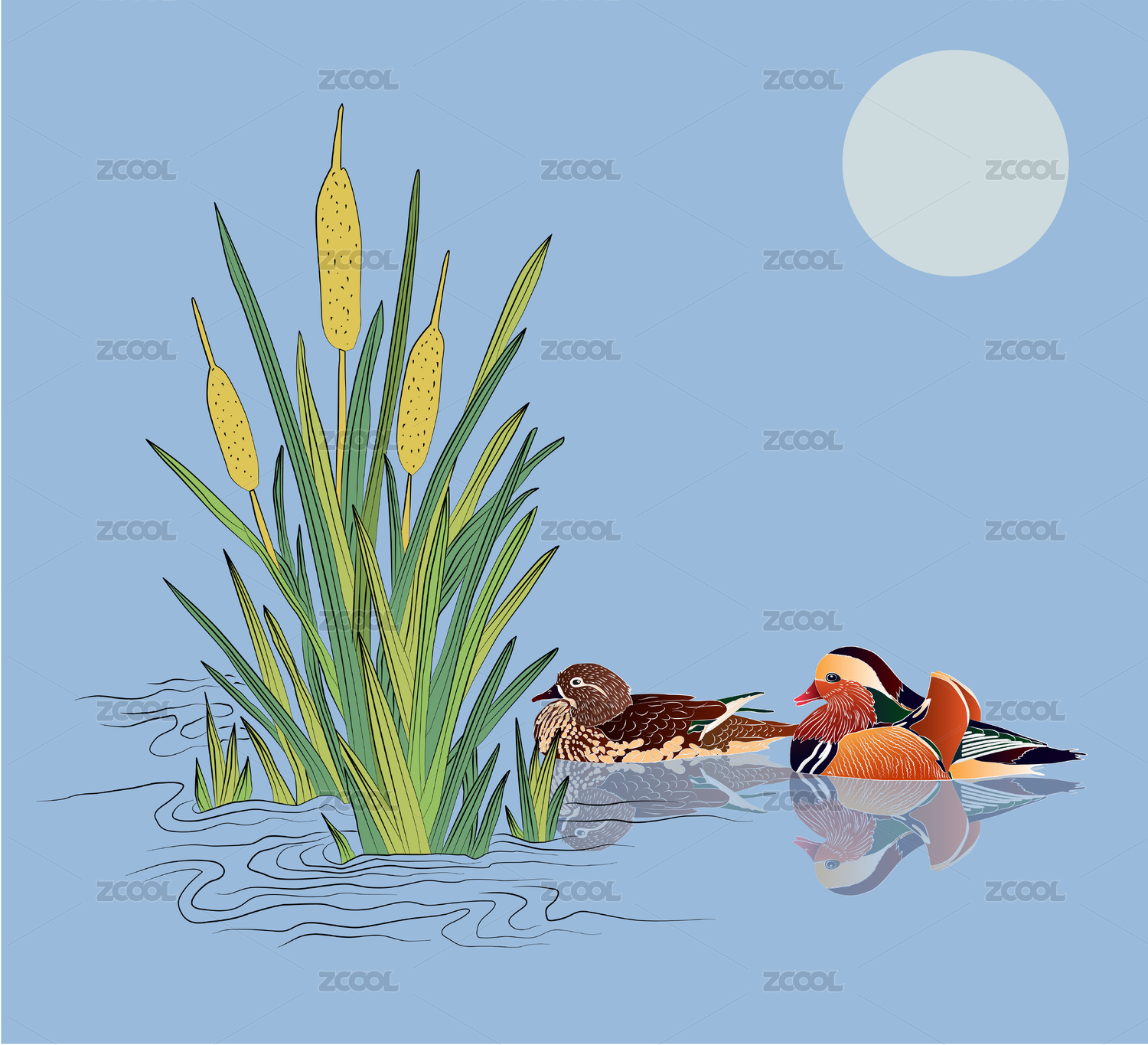 中國風(fēng)香蒲蘆葦水鳥鴛鴦國潮工筆矢量插畫