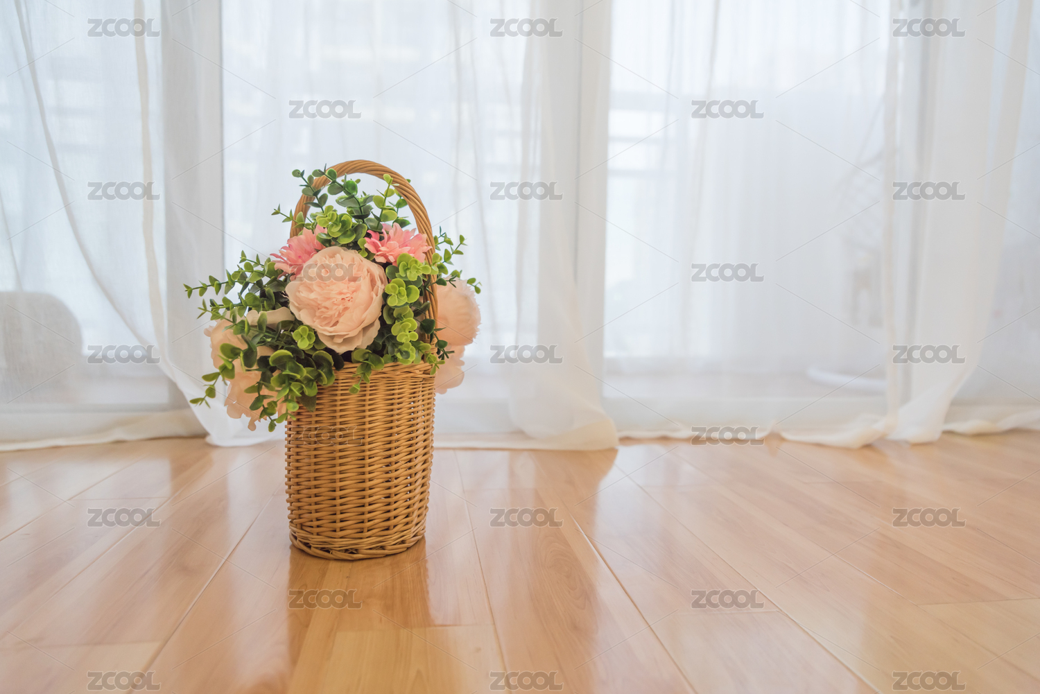 室內(nèi)木地板上的竹花籃