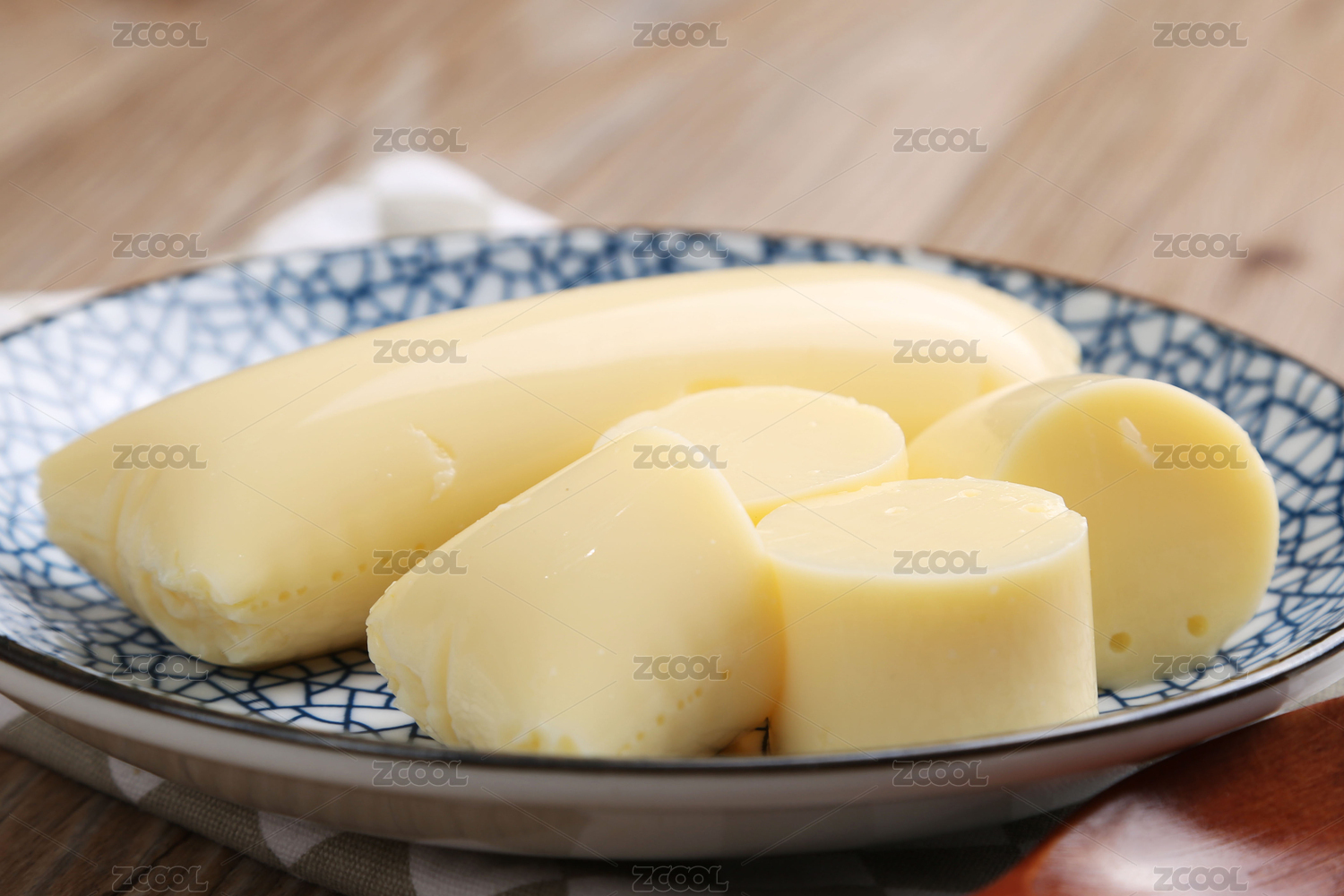 藍(lán)色背景上白色圓瓷盤中的日本豆腐
