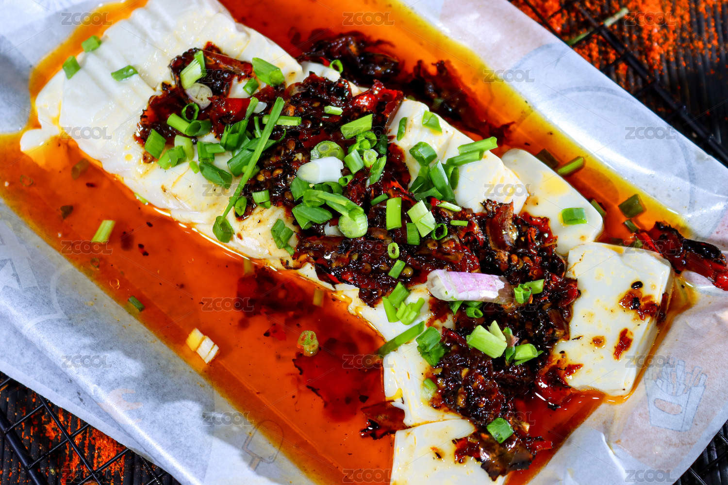 淺藍(lán)色背景上一盤剁椒日本豆腐荷包蛋