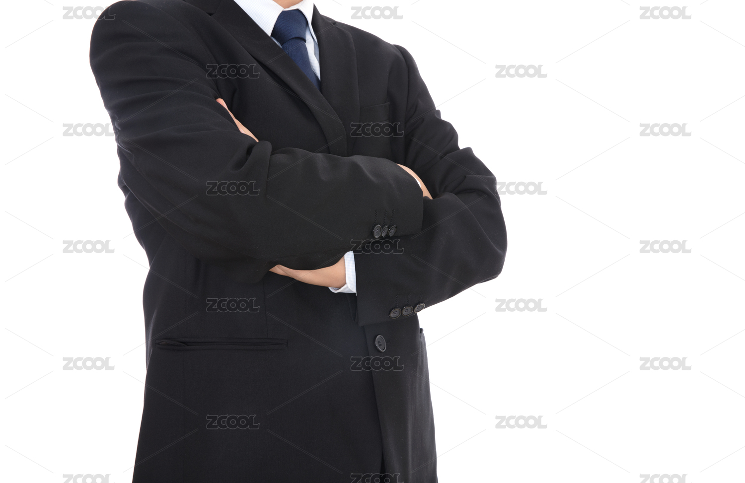 穿著黑色西裝的成功人士抱著胳膊站在白背景前