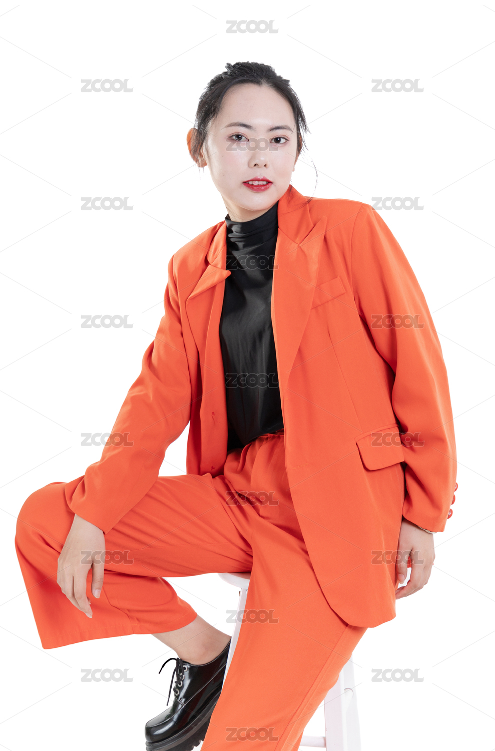坐在凳子上的橙色西裝時尚女孩