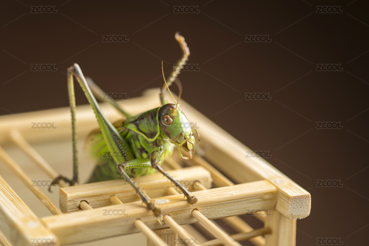 關(guān)在蟈蟈籠子中的螽斯科鳴蟲蟈蟈特寫