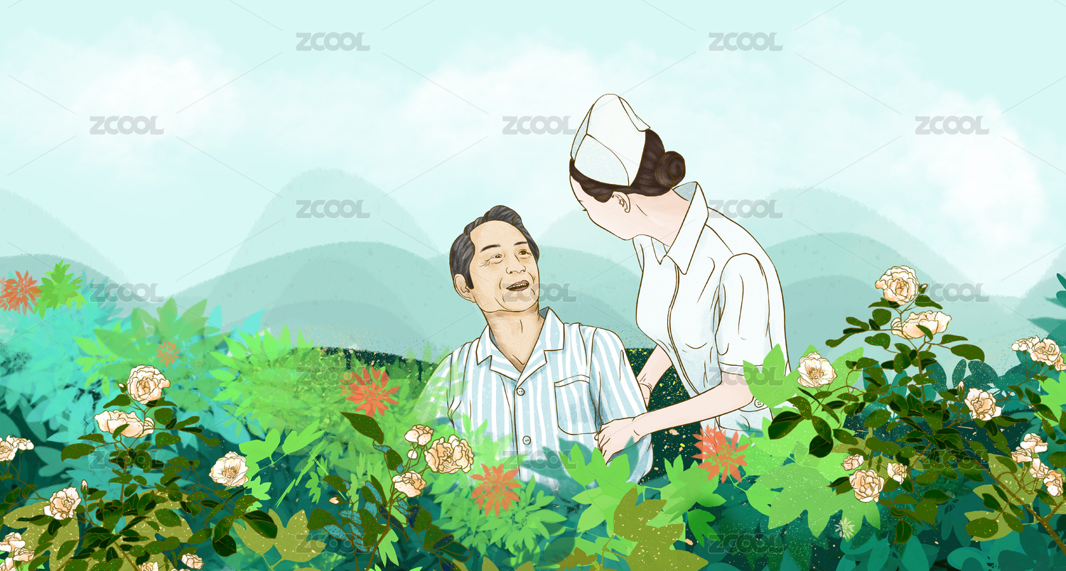 春天櫻花樹前兩個(gè)醫(yī)護(hù)工作者和康復(fù)者比心