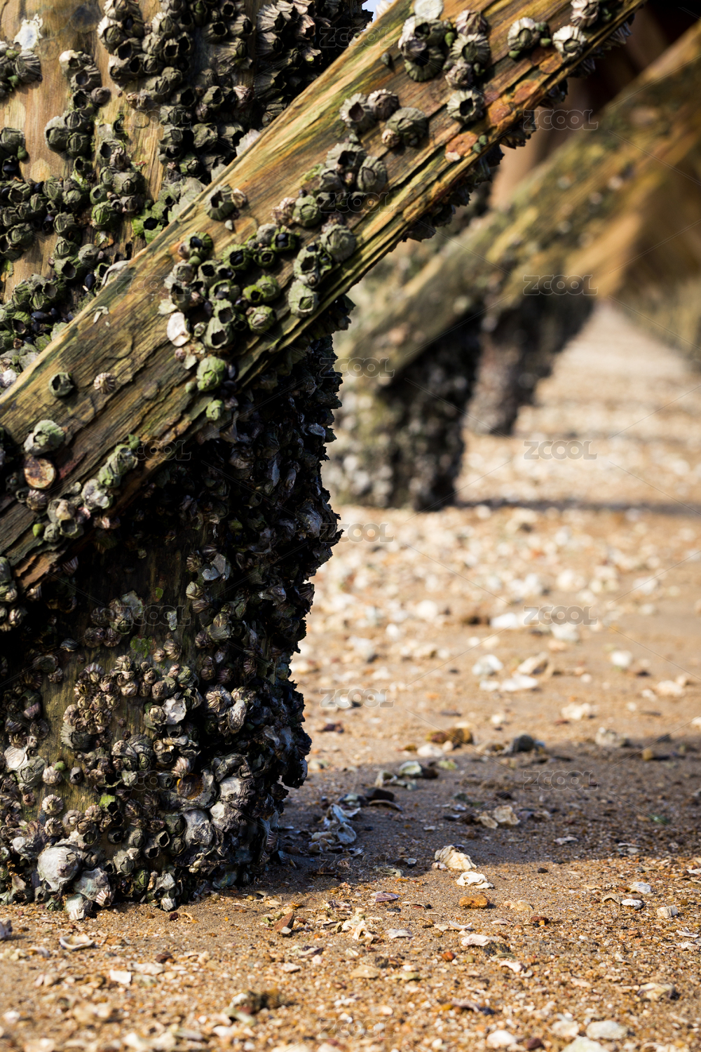 陽光下木質(zhì)棧道上爬滿貝類的木柱