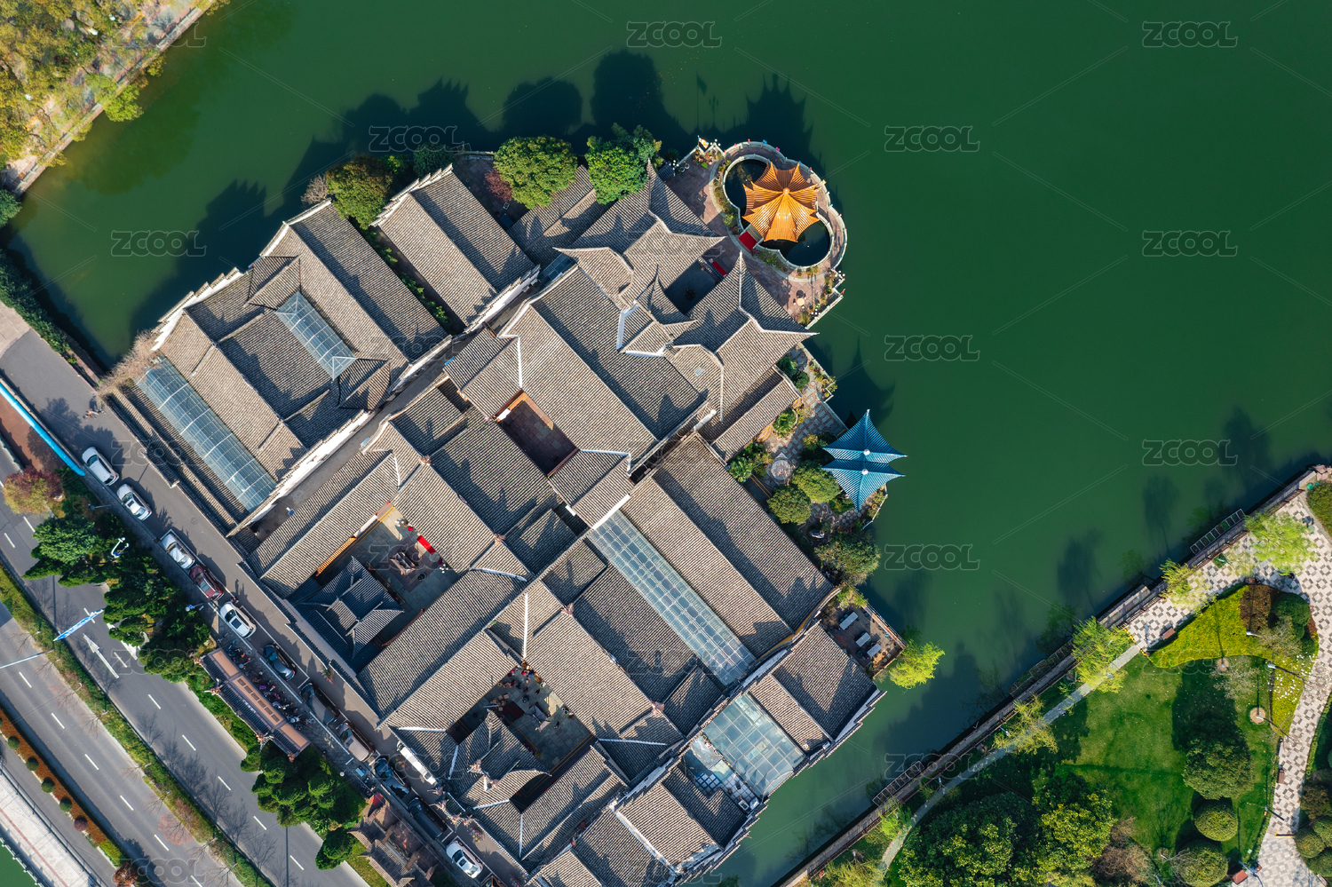 從天空俯視浙江寧波市海曙區(qū)月湖佛教居士林