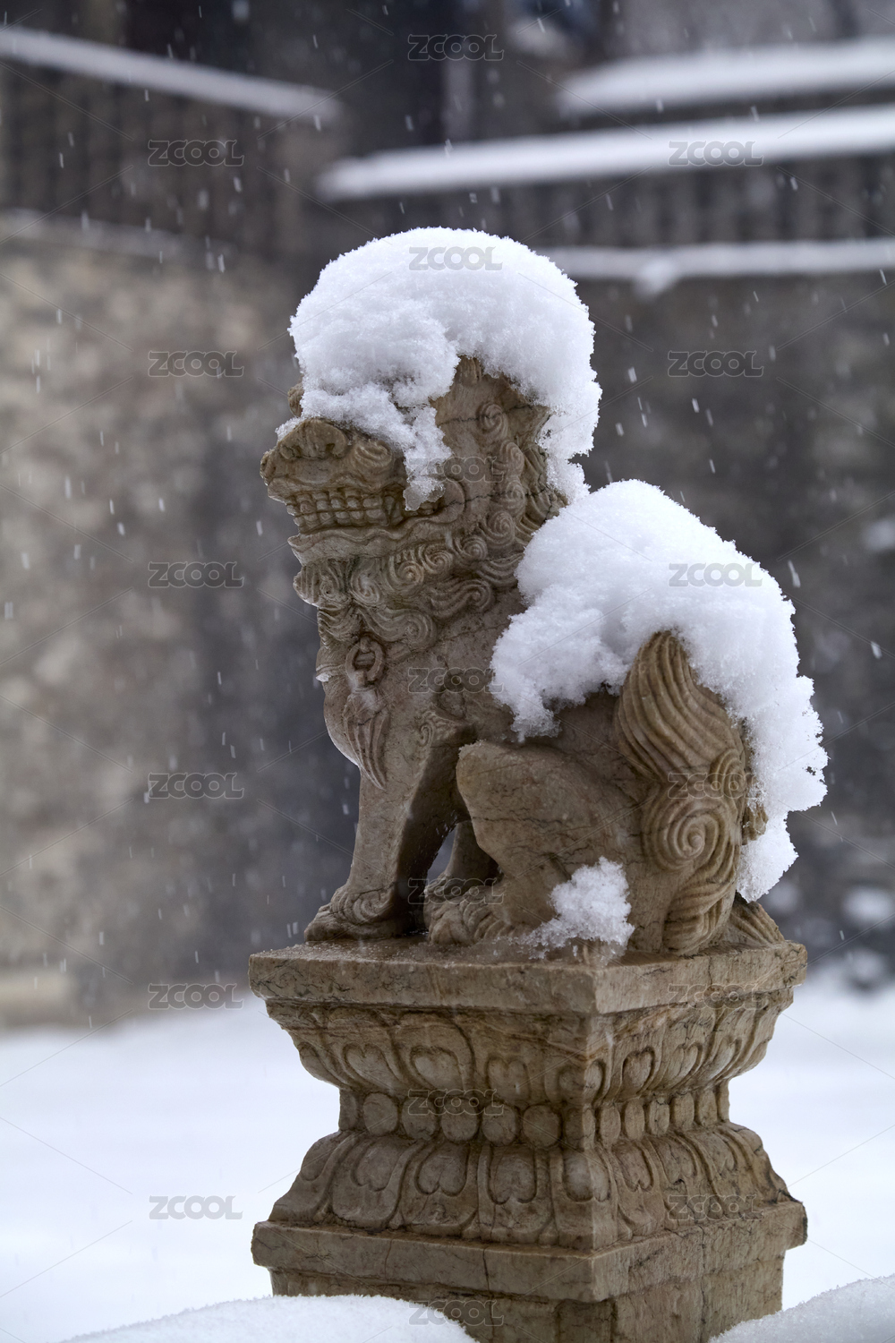 下雪時,清福陵內(nèi)的獅子雕像