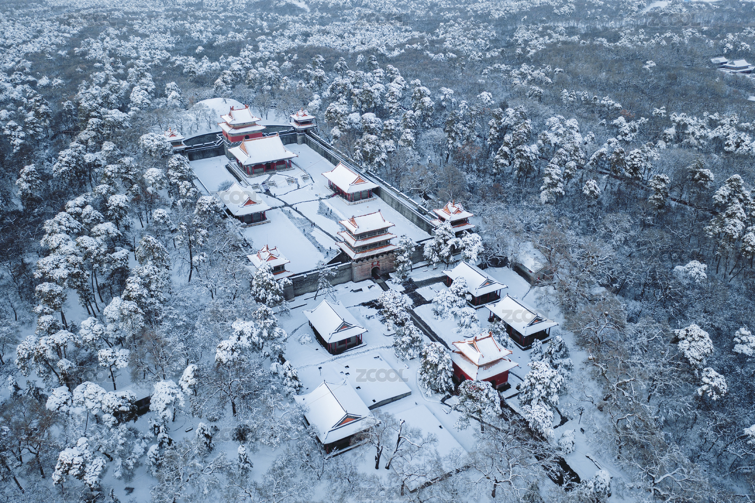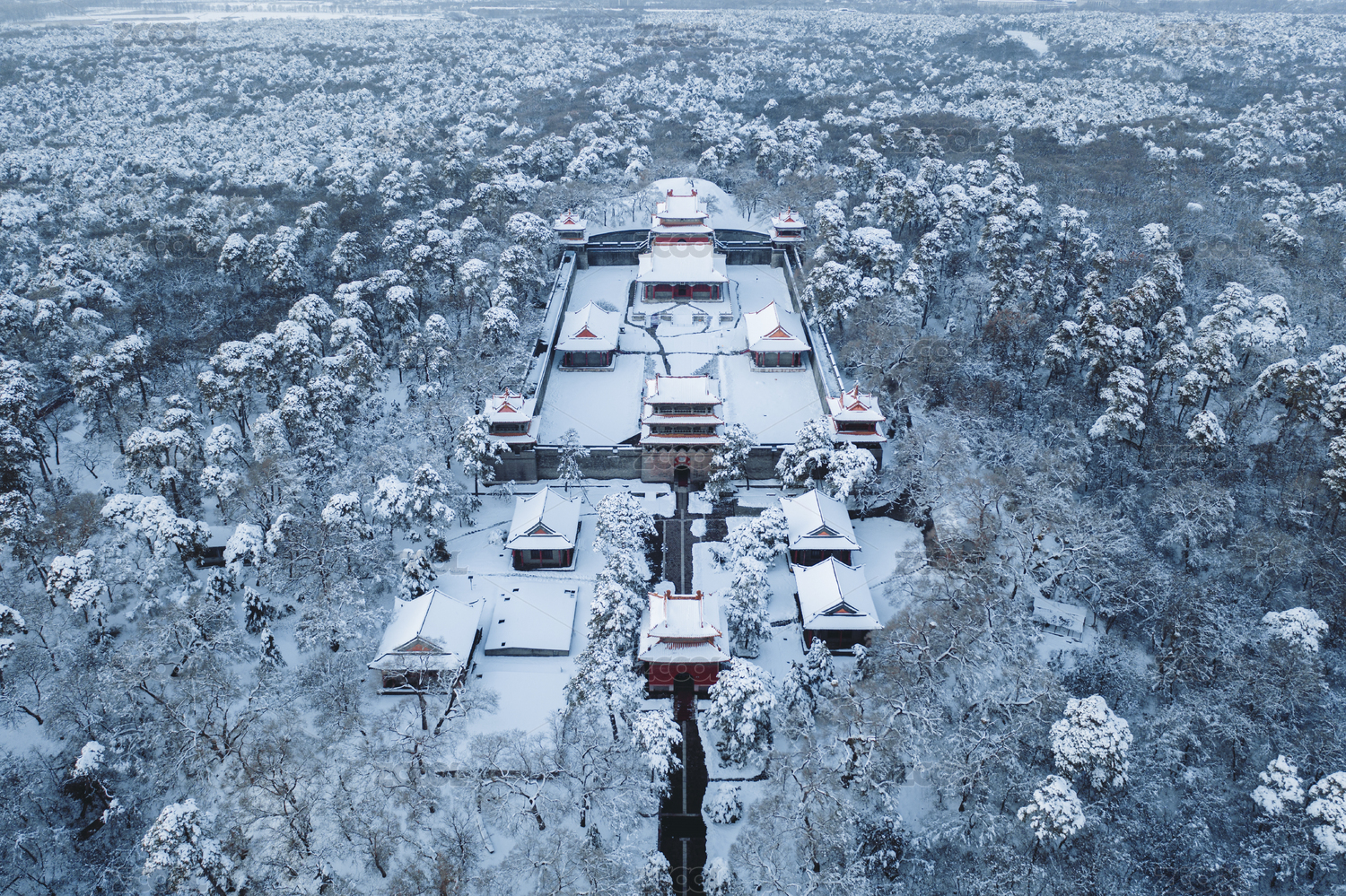 沈陽古建筑東陵清福陵冬季雪景全景航拍