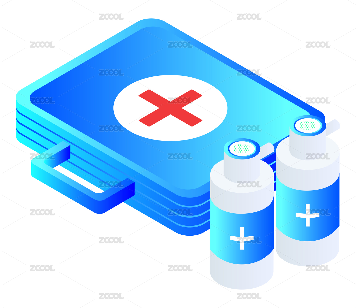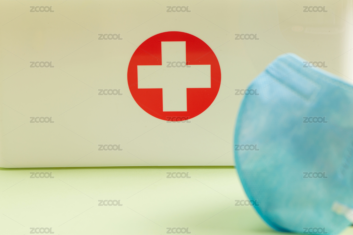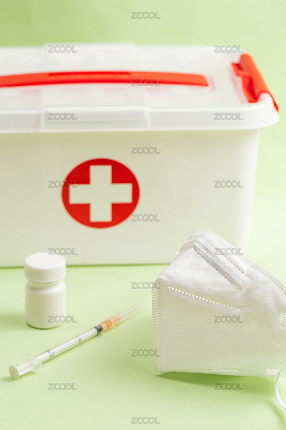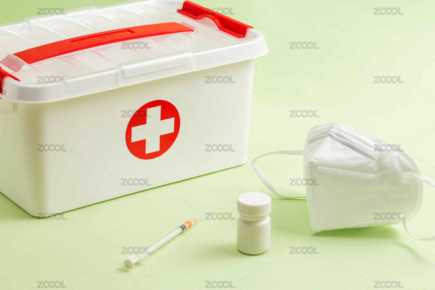 白色醫(yī)藥箱醫(yī)用酒精瓶和5個口罩