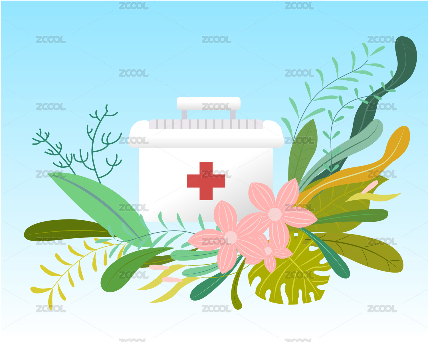 一只白色的醫(yī)藥箱周邊是美麗的花叢植物