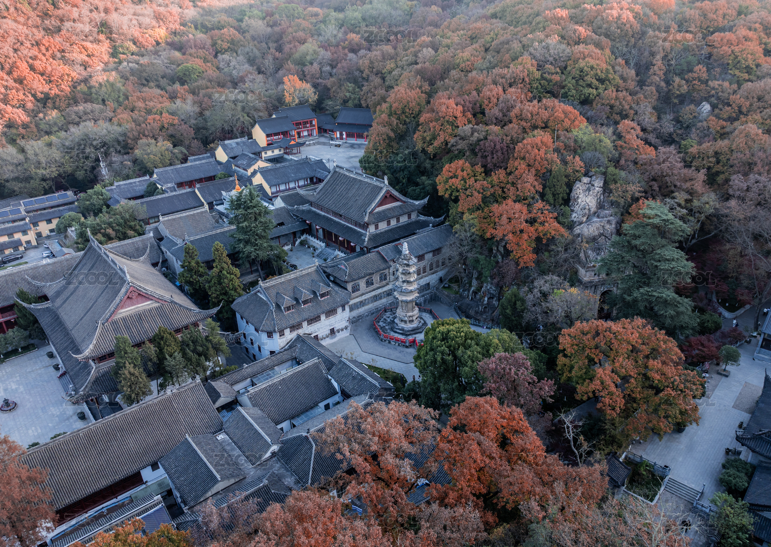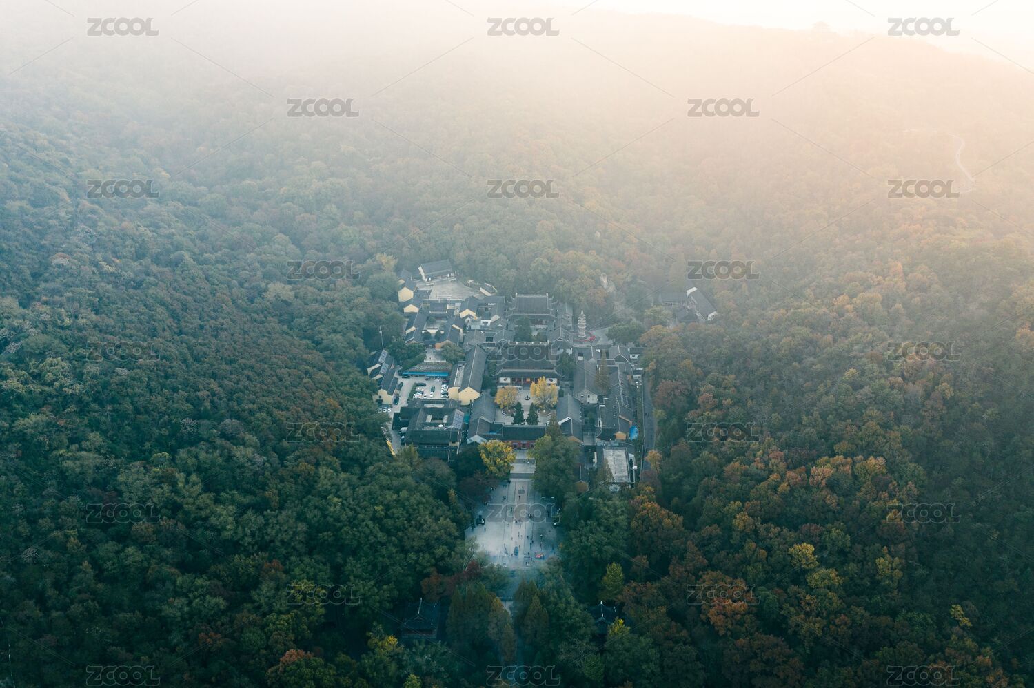 航拍秋季日出時(shí)的南京棲霞山下棲霞寺