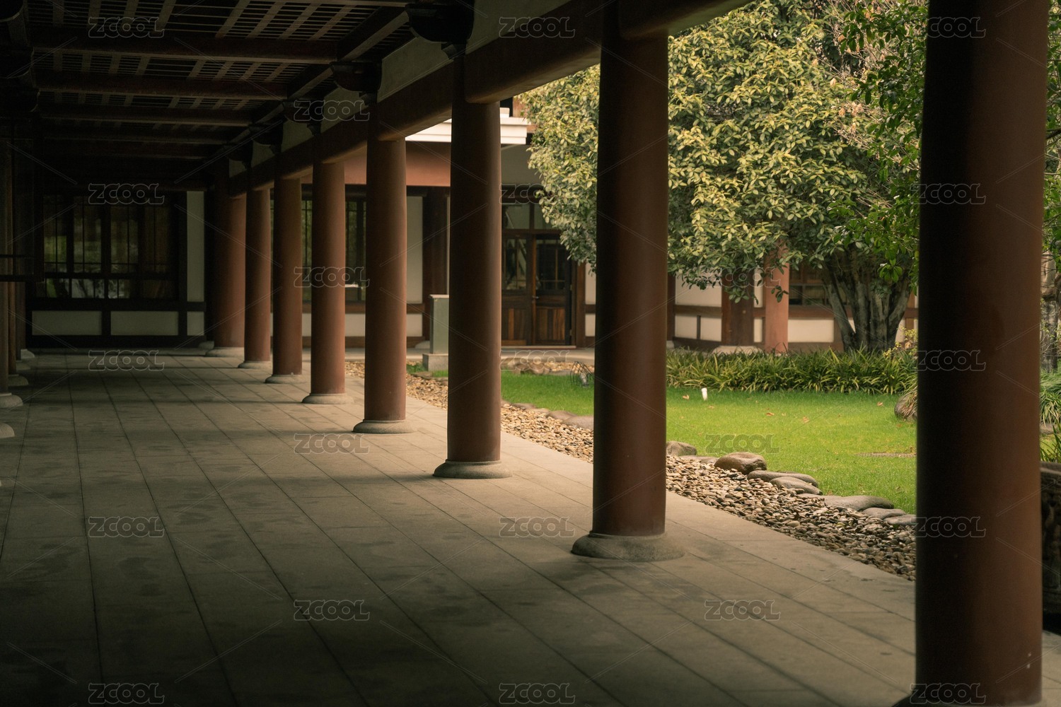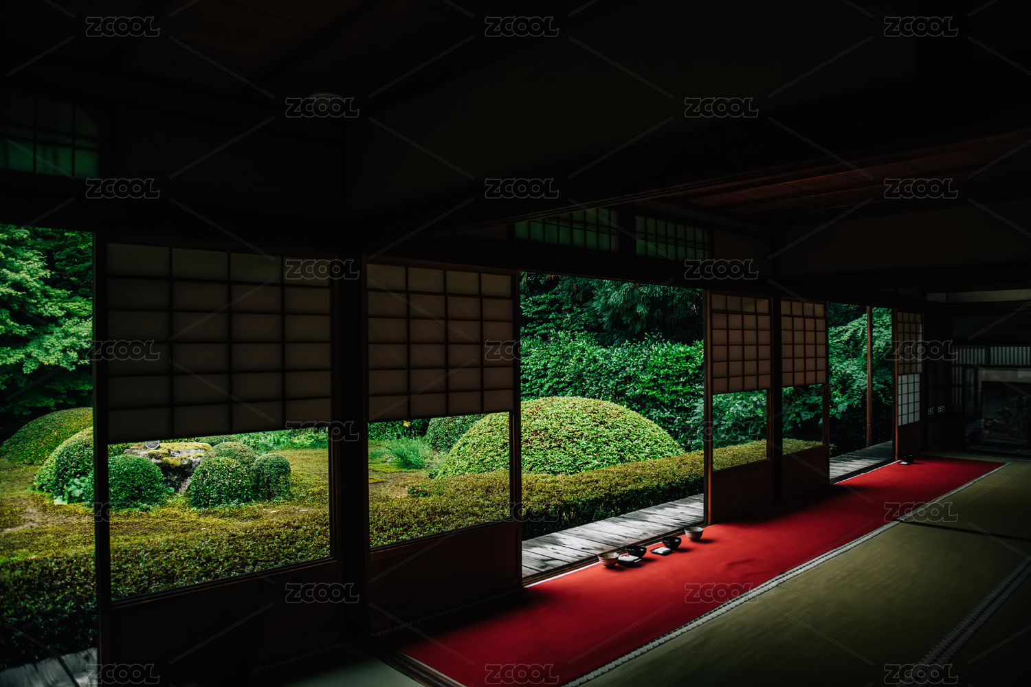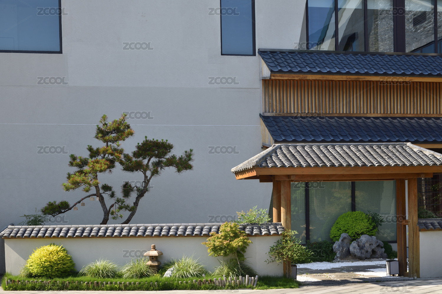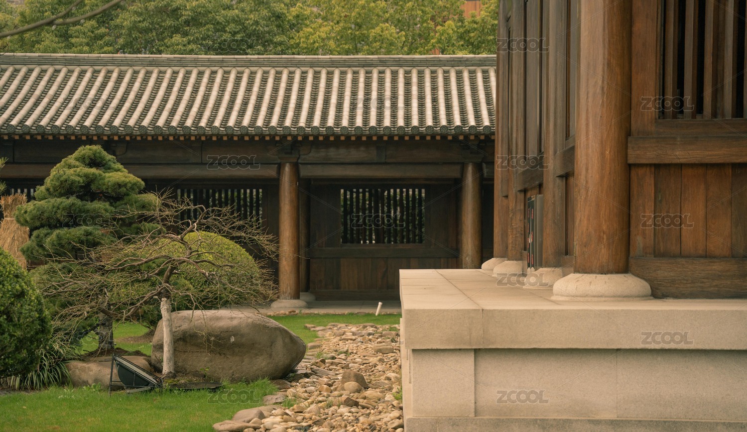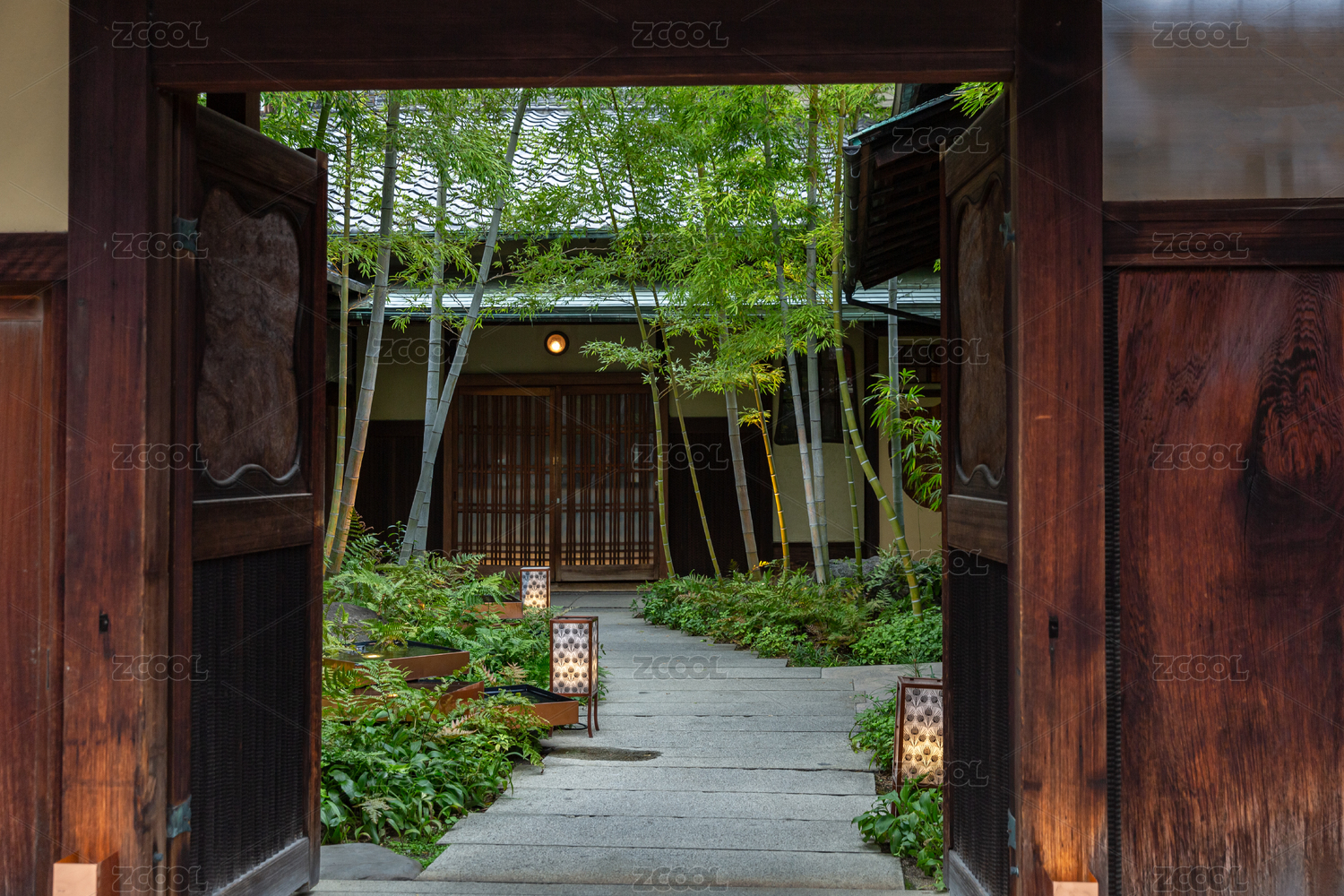 木質(zhì)大門內(nèi)的日式庭院景觀