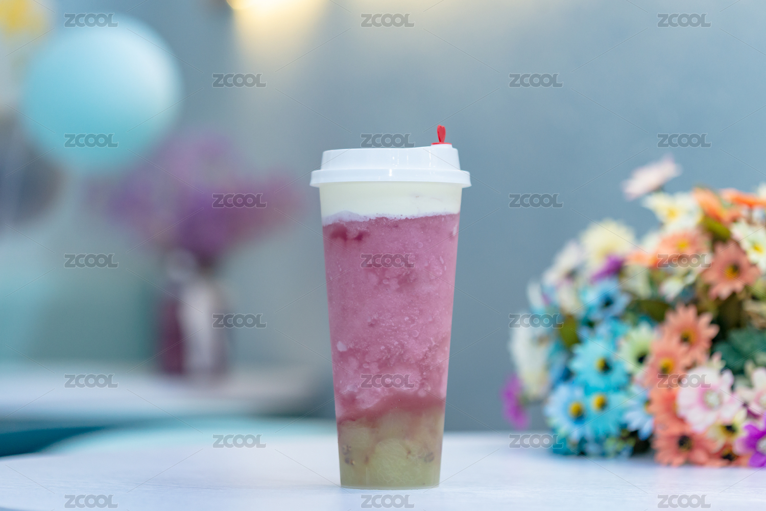 休閑吧白色桌子上放置的紫色飲料和花束
