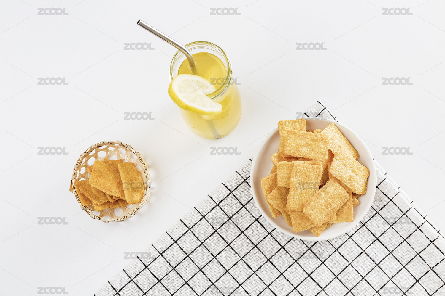 放在白色格子餐布上的小米鍋巴和檸檬飲料麥穗